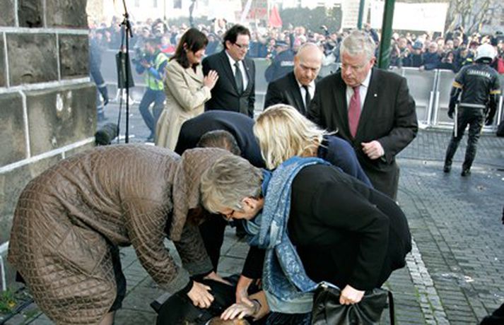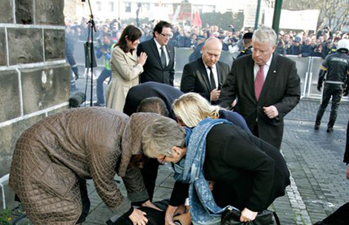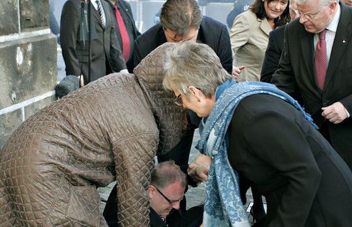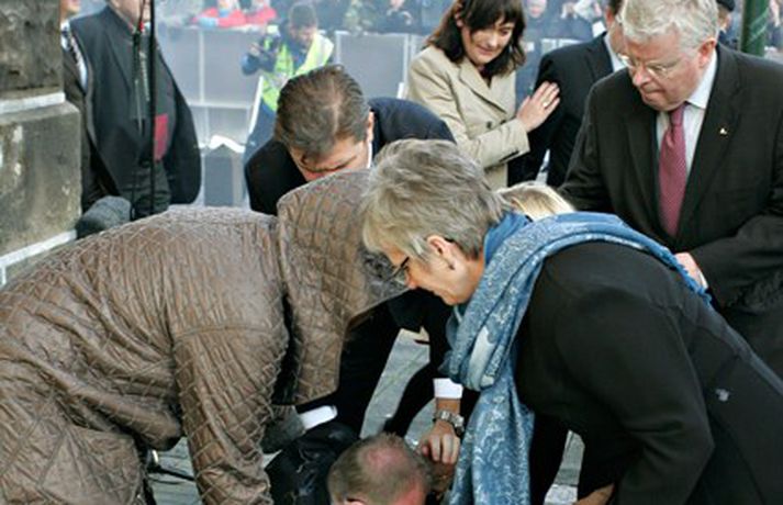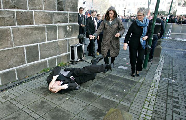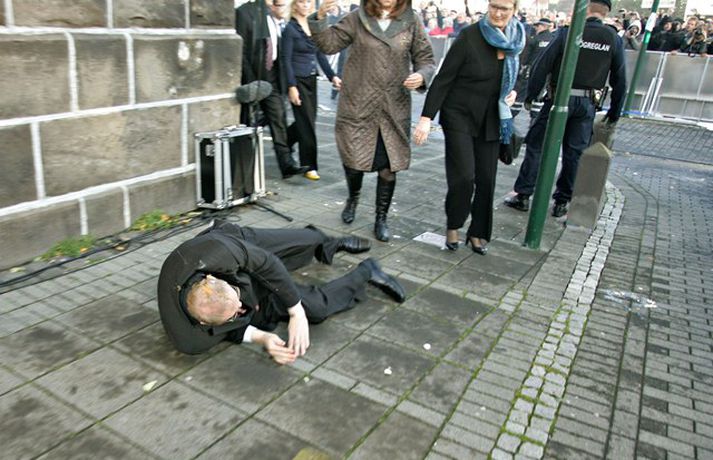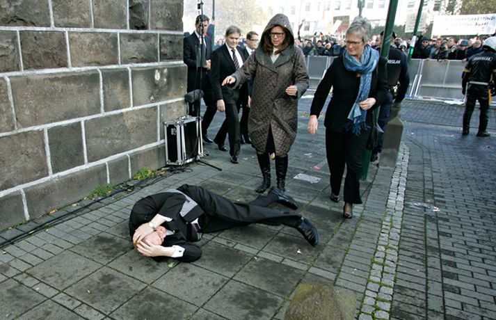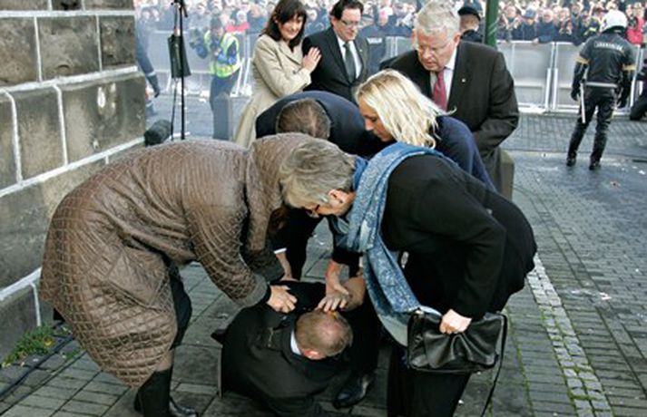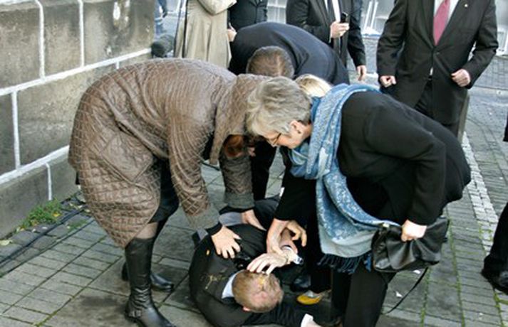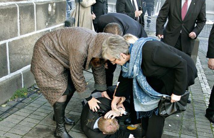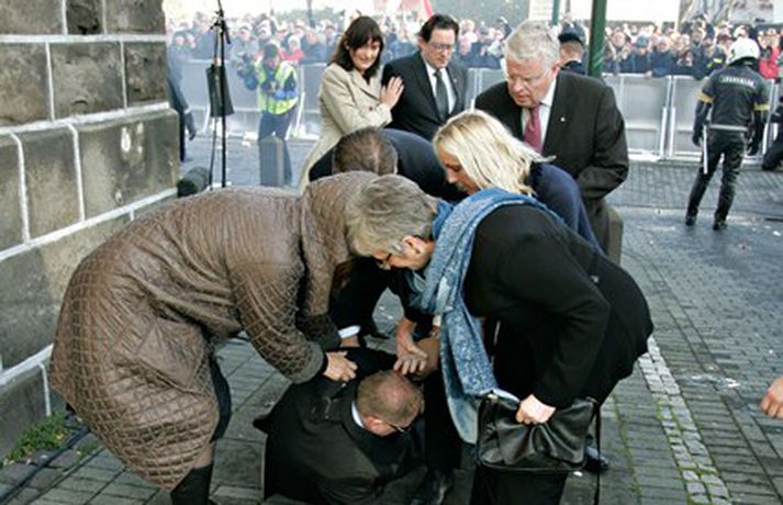 Þingmönnum brugðið þegar Árni Þór féll 1. október 2011 17:01 Álfheiður Ingadóttir, Þuríður Backman, Unnur Brá Konráðsdóttir og fleiri þingmenn hjálpa Árna. Mynd/ Daníel Rúnarsson. Það er óhætt að segja að þeim þingmönnum sem næst stóðu Árna Þór Sigurðssyni hafi verið brugðið þegar hann féll í götuna eftir að hafa fengið egg í gagnaugað. Þeir voru þó fljótir að átta sig og komu honum til bjargar. Árni Þór sagði í samtali við Vísi fyrr í dag að hann hefði skilning á því að fólk mótmælti en það væri synd ef mótmælin fælu í sér skemmdir eða ofbeldi. Myndirnar sem, Daníel Rúnarsson ljósmyndari tók og eru birtar hér að neðan segja meira en mörg orð. Mest lesið Kamilla Bretadrottning greinir frá kynferðisofbeldi Erlent Vanhelgunin ýmist skemmdarverk eða persónuleg árás Innlent Eitthvað í íslensku samfélagi fjandsamlegt börnunum okkar Innlent Segir myndbandsupptöku af því þegar skórnir voru teknir Innlent Simmi vinsælasti leynigesturinn Innlent „Margir sem því miður eru ekki jafn heppnir og ég“ Innlent Gummi lögga er maður ársins 2025 Innlent „Þetta er Íslandsmet, Íslandsmet í svikum“ Innlent Gleðilegt nýtt ár kæru lesendur Vísis Innlent Dótturdóttir JFK er látin Erlent Fleiri fréttir Gleðilegt nýtt ár kæru lesendur Vísis Eitthvað í íslensku samfélagi fjandsamlegt börnunum okkar Simmi vinsælasti leynigesturinn „Þetta er Íslandsmet, Íslandsmet í svikum“ Tal um Ingu eftir kosningar ekki til sóma Gummi lögga er maður ársins 2025 Árangur breyti ekki alltaf upplifun fólks „Viðreisn jafnvel erfiðari viðfangs en Flokkur fólksins“ Vara við hættu á sinubruna Haldlögðu metmagn af fíkniefnum á árinu Vanhelgunin ýmist skemmdarverk eða persónuleg árás Árið gert upp í Kryddsíld 2025 Hafþór Freyr maður ársins að mati lesenda Vísis og hlustenda Bylgjunnar Segir myndbandsupptöku af því þegar skórnir voru teknir Tveir með alvarlega áverka eftir hnífstunguárás Vonast til að rafmagn verði komið á seinni partinn Rúmur helmingur bjartsýnn fyrir 2026 Grunaður um stórfellda líkamsárás og frelsissviptingu „Við bara svolítið sitjum uppi með þetta“ Börn niður í leikskólaaldur um helmingur þeirra sem slasast „Margir sem því miður eru ekki jafn heppnir og ég“ Sátt við fyrsta árið og taka stöðuna vegna forfalla ráðherra á næstu dögum Tíu létust í umferðinni á árinu og alvarlegustu slysunum fækkar ekki Árangur aðgerða ekki staðist væntingar almennings Enn fleirum sagt upp hjá Árvakri Ríkisstjórnin sek um ósanngjarna mismunun Vonbrigði í menntamálum og áramótasprengja Hafa áhyggjur af frelsissviptingu barna í brottfararstöð Kristrún ræðir við Pétur um borgarstjórnarframboð Níu ráðherrar funda með Höllu Sjá meira