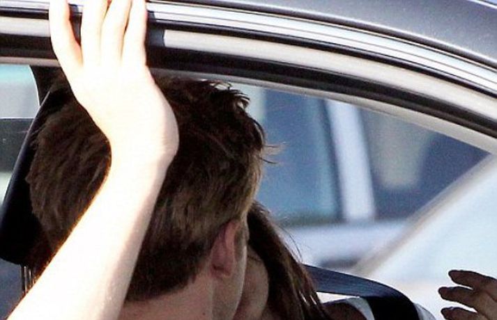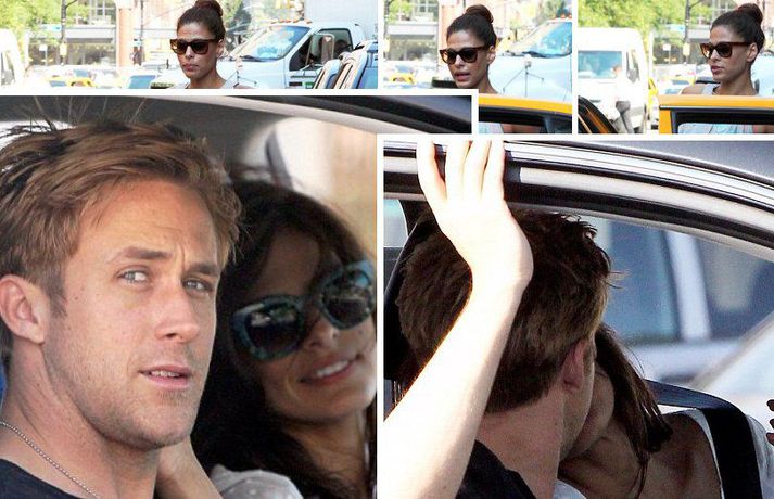 Drive stjarnan Ryan Gosling, 30 ára, og leikkonan Eva Mendes, 37 ára, kysstust í bílnum hans eftir að þau keyptu sér ískaffi í Los Angeles í gær. Ryan var brugðið þegar hann áttaði sig á því að kossarnir voru myndaðir en Evu var slétt sama og strauk vanga hans alsæl eins og sjá má á myndunum. Í síðustu viku fór af stað orðrómur um að ástin hefði kviknað hjá stjörnunum eftir að sást til þeirra leiðast og kyssast í Disneylandi. Ryan sagði í nýlegu viðtali að ástarsambönd í Hollywood væru að hans mati dauðadæmd og að hann væri sáttur við að eiga í traustu ástarsambandi við starfið sitt eins og um eiginkonu hans væri að ræða.