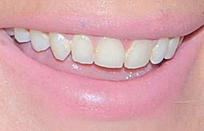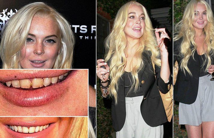 Leikkonan Lindsay Lohan, 25 ára, gerir töluvert af því að þamba kaffi og svo reykir hún eins og strompur. Kaffiþambið og nikótínneyslan skín í gegn þegar hún brosir eins og sjá má á myndunum. Tennur leikkonunnar eru langt frá því að vera í stíl við perluhvít stellin sem stjörnurnar í Hollywood skarta því brosið hennar Lindsay er gult með brúnum blæ sem fer fram hjá fáum þegar hún brosir.
