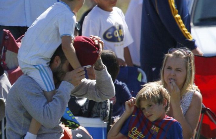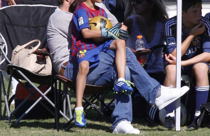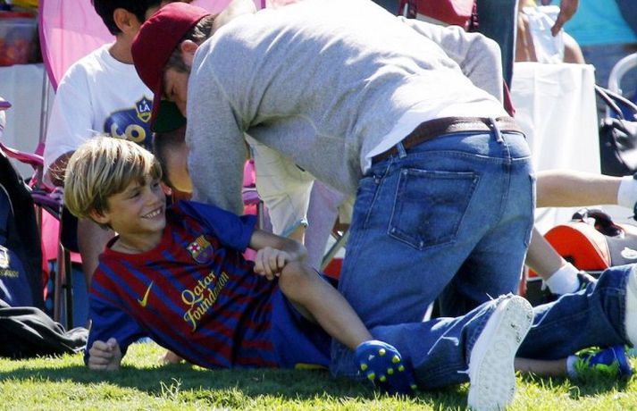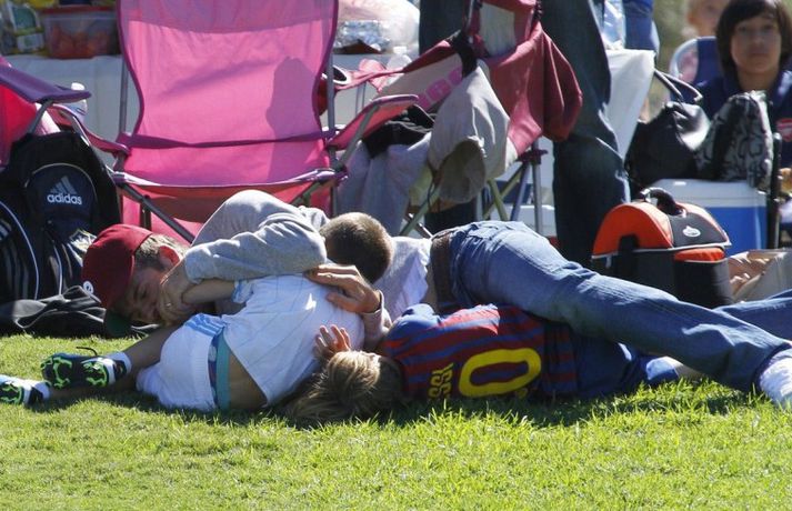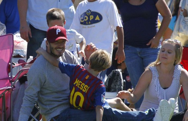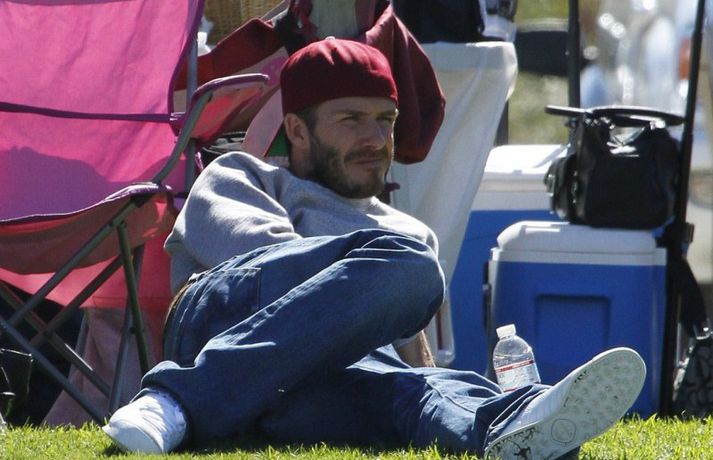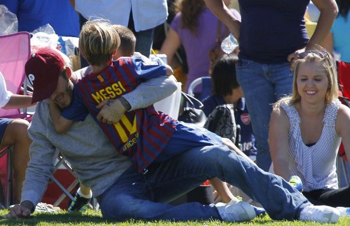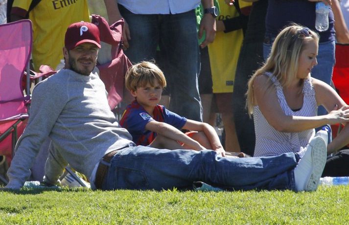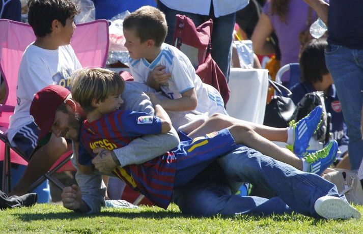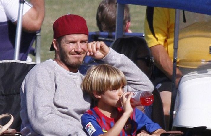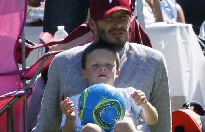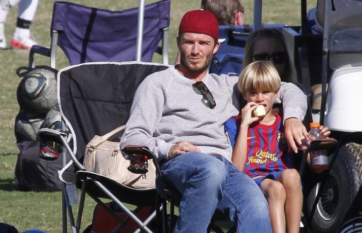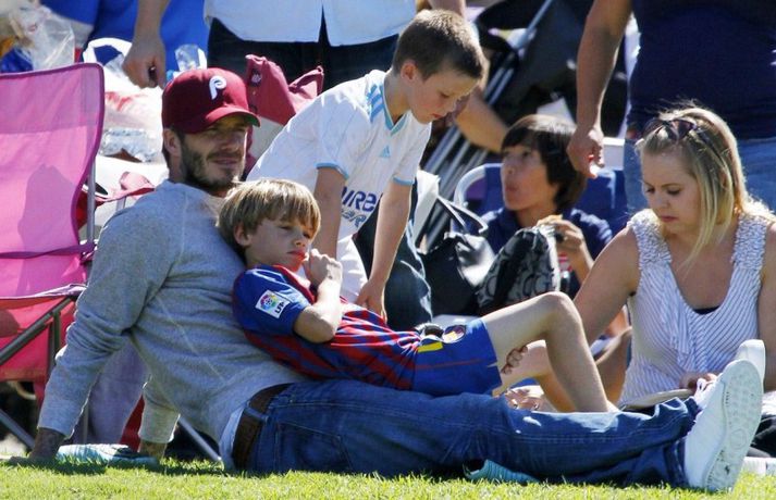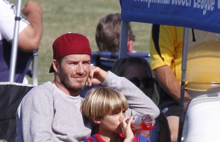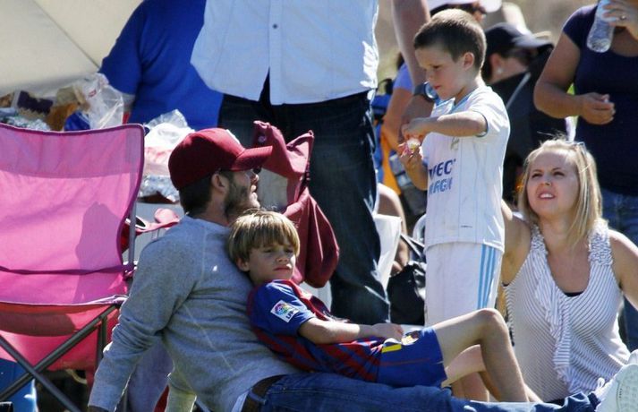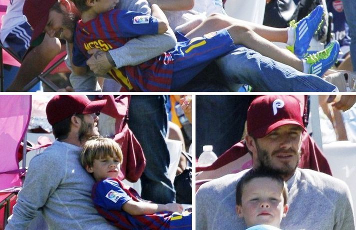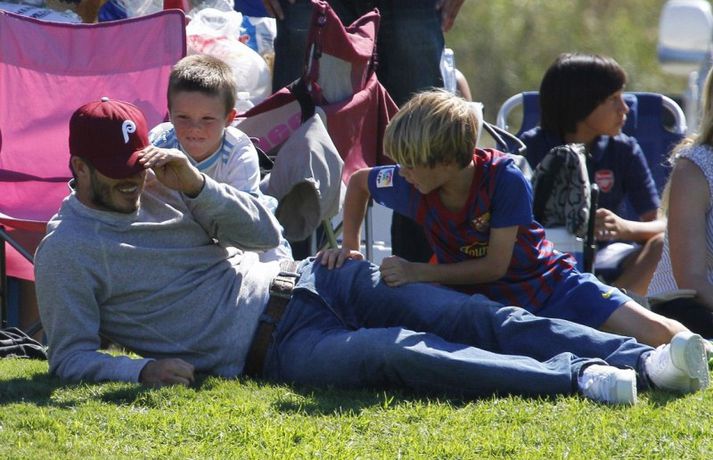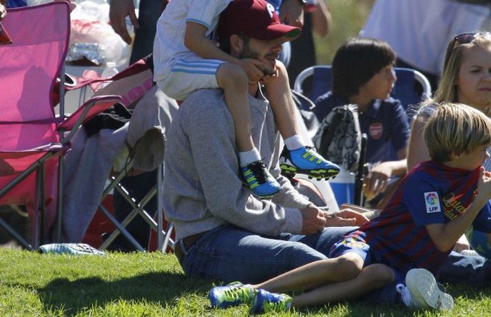 David Beckham, 35 ára, og synir hans, Cruz, Brooklyn og Romeo, nutu samverunnar á fótboltaleik í Los Angeles á sunnudaginn eins og sjá má á myndunum. David eyddi deginum í að fylgjast með drengjunum keppa í fótbolta. Systir þeirra, Harper, og móðir, Victoria, voru fjarri góðu gamni.Þegar þú hugsar um þinn betri helming þegar þú ættir að vera að hugsa um eitthvað allt annað... það er rómantík, sagði David.