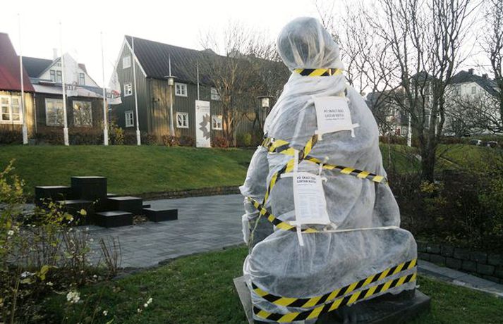 Það er bannað að njóta listar í dag 1. nóvember 2011 11:07 Búið er að pakka Jóni Sigurðssyni inn. Mynd Sigurjón Í dag er bannað að njóta lista, en bandalag íslenskra listamanna (BÍL) stendur fyrir listalausa deginum í dag. Þannig hafa listamenn pakkað styttum í miðborg Reykjavíkur inn í plast svo það sé örugglega ekki hægt að njóta listarinnar. Markmið listalausa dagsins er að vekja athygli fólks á þýðingu lista og menningar í daglega lífinu. Það kann því að reynast þrautinni þyngri að fara eftir boðorðunum fimmtán, sem gefin hafa verið út í tilefni dagsins, en það verður gaman að leggja sig fram um að reyna. Hér fyrir neðan má lesa boðorðin þar sem fólki er meðal annars bannað að hlusta á tónlist, spila tölvuleiki með grafískri mynd og horfa á bíómyndir. Boðorðin eru: 1. Ekki fara á listasöfn, hönnunarsöfn, gallerí eða minjasöfn sem geyma listaverk. 2. Ekki horfa á myndlistarverk, þar með talin málverk, ljósmyndir, höggmyndir og innsetningar, hvort sem er úti sem inni. 3. Ekki fara á tónleika. 4. Ekki hlusta á tónlist, hvorki af CD, vínil, snældu, stafrænum tónlistarspilurum né snjallsímum (hringitónar meðtaldir). 5. Ekki spila tölvuleik með grafískri mynd. 6. Ekki fara á danssýningu. 7. Ekki lesa skáldsögu, ljóð eða nokkurn annan texta sem talist gæti til fagurbókmennta. 8. Ekki fara í leikhús. 9. Ekki horfa á kvikmynd, hvorki í bíó, af tölvu, í sjónvarpi né hverskonar skjá 10. Ef einhvers konar listaverk birtist í sjónvarpi, t.d. í fréttum eða auglýsingum, ber að loka augunum eða líta undan. 11. Ef tónverk heyrist í sjónvarpi eða útvarpi ber að lækka niður í tækinu. 12. Ekki horfa á byggingar sem eru hannaðar af arkitekt. 13. Ekki horfa á eða ganga um garða sem eru hannaðir af landslagsarkitekt. 14. Ekki horfa á eða ganga í sérhönnuðum fötum eftir fatahönnuð. 15. Ekki gera neitt eða njóta neins sem hægt væri að túlka sem list eða hefur í sér listrænt gildi, þar með talin verk dansara, hönnuða, kvikmyndagerðarmanna, leikara, myndlistar-manna, rithöfunda og tónlistarmanna. Mest lesið Skipuðu húsráðanda að elda fyrir sig áður en ræningjarnir ruddust inn Innlent Föðurnum enn haldið sofandi í öndunarvél Innlent Halldór Blöndal borinn til grafar Innlent Frímúrarareglan vill lögbann á nýjar lögreglureglur Erlent Kolbrúnu Bergþórs sagt upp á Mogganum Innlent Trump hótar skelfilegum afleiðingum afvopnist Hamas ekki Erlent Stoltastur af veiðigjaldinu og telur aðrar skattabreytingar hafa lítil áhrif á heimilin Innlent Fannst látinn utandyra í Borgarnesi Innlent Sagt upp eftir 26 ár á Morgunblaðinu Innlent Erlendir ferðamenn talsvert slasaðir eftir áreksturinn Innlent Fleiri fréttir Stoltastur af veiðigjaldinu og telur aðrar skattabreytingar hafa lítil áhrif á heimilin Föðurnum enn haldið sofandi í öndunarvél Fylgi stjórnarflokkanna dalar Föðurnum í Suður-Afríku enn haldið sofandi Skipuðu húsráðanda að elda fyrir sig áður en ræningjarnir ruddust inn Fannst látinn utandyra í Borgarnesi Halldór Blöndal borinn til grafar Fimm með vanlíðan komast í Skjólshús í tvær vikur Kolbrúnu Bergþórs sagt upp á Mogganum Sagt upp eftir 26 ár á Morgunblaðinu Kominn tími á gos og Veðurstofan öllu viðbúin Sýknuð af ólöglegum innflutningi lyfja vegna rangra upplýsinga Lyfjastofnunar Þriggja hatta Inga segir engin ráðherraskipti í pípunum Desember að komast á lista yfir þá allra hlýjustu Erlendir ferðamenn talsvert slasaðir eftir áreksturinn Samið um Skjólshús og gos gæti komið á hverri stundu Hér verða áramótabrennur á gamlársdag 2025 Björn Ingi leiðir ekki Miðflokksmenn í borginni Gestir á Edition stukku út á náttfötunum Þurrkuðust út af þingi en sitja á tugum milljóna króna Óvenju mikið að gera hjá slökkviliðinu Sósíalistar líta til harðstjórnarríkja sem fyrirmynda Þrír réðust á einn og höfðu af honum farsíma Tvær þyrlur sækja fjóra eftir alvarlegan árekstur á Fagurhólsmýri „Rúllandi rafmagnsleysi“ alla daga og tífaldur þungi í árásum „Gamla góða Ísland, bara betra“ Gróður farinn að grænka fyrir norðan Ferðakostnaður forsetans rúmar tuttugu milljónir Sakamálin sem einkenndu árið sem er á enda Ekki boðlegt að þingið hunsi þjóðaratkvæðagreiðslu Sjá meira