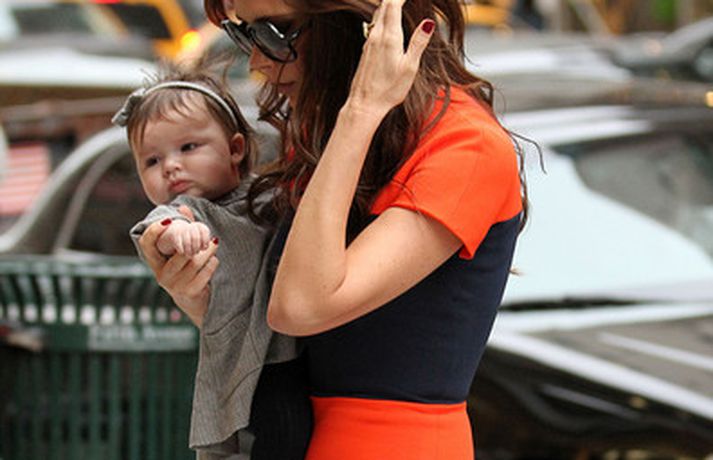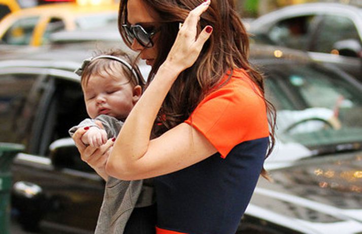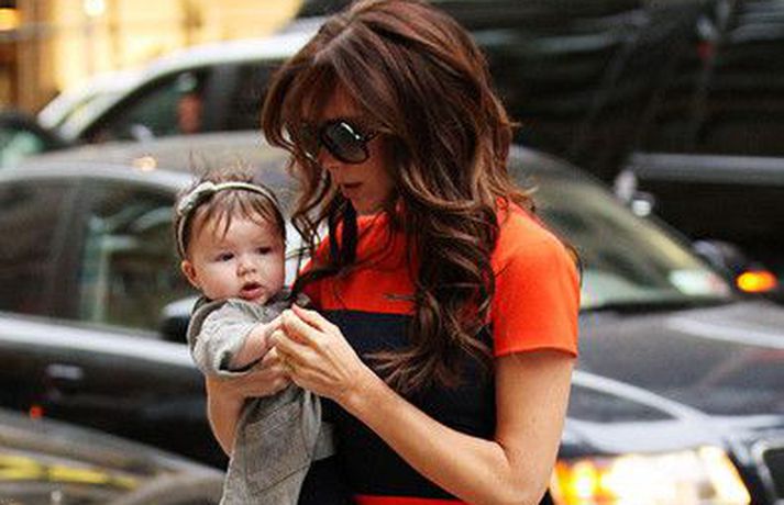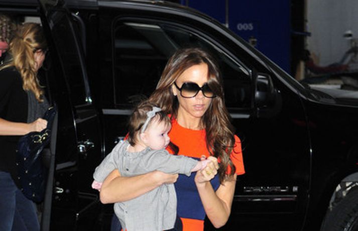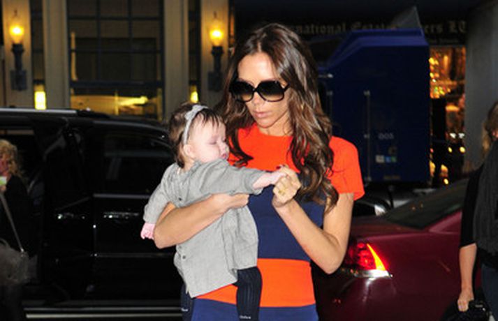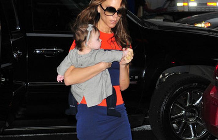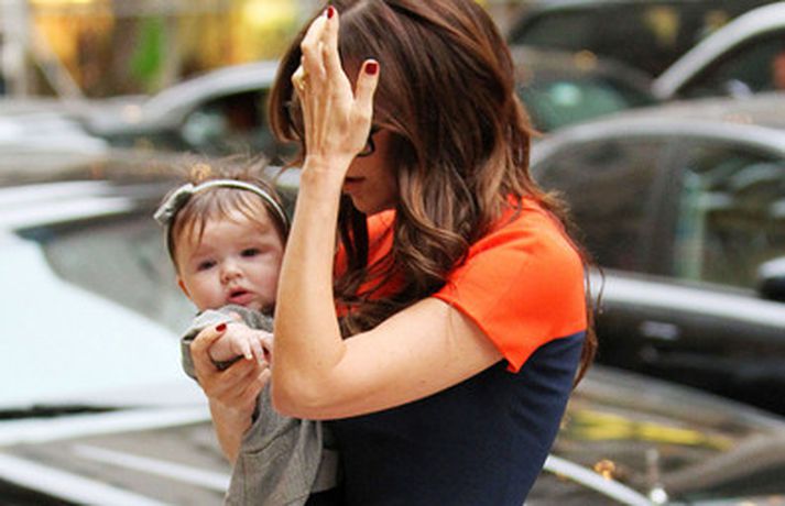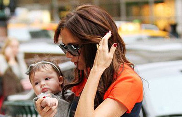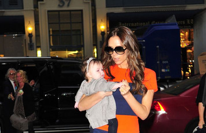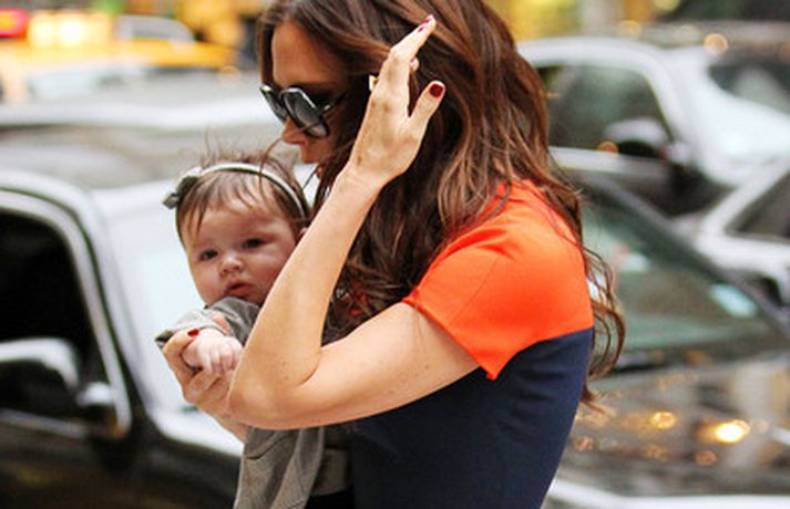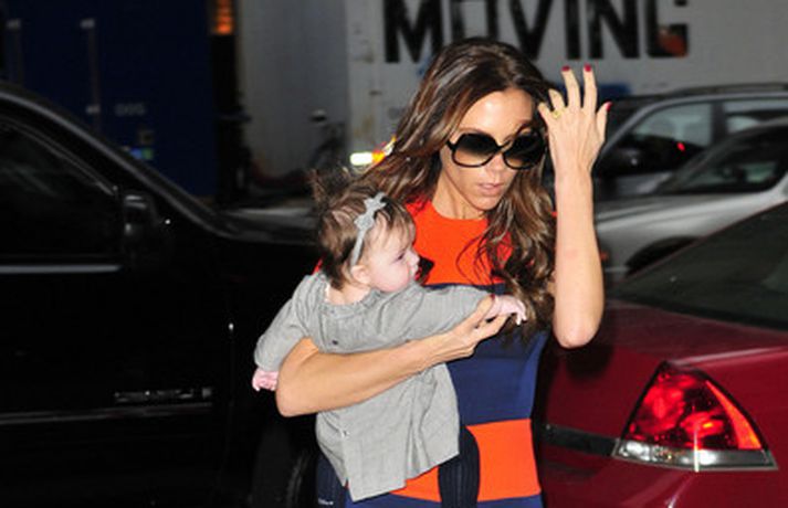 Victoria Beckham, 37 ára, hélt þéttingsfast á stelpunni sinni, Harper, á leið þeirra á Nobu veitingahúsið í New York í gær. Fyrr sama dag fóru mæðgurnar í verslunarleiðangur.