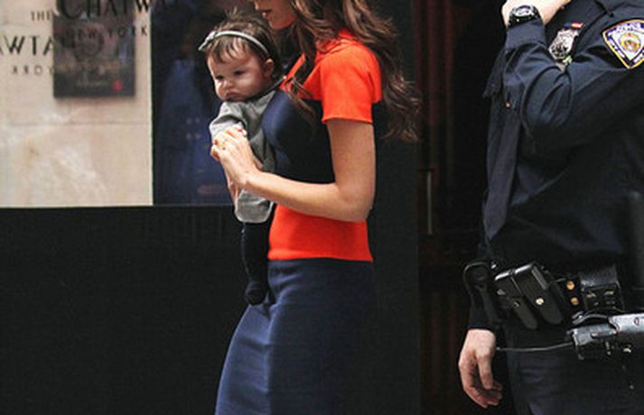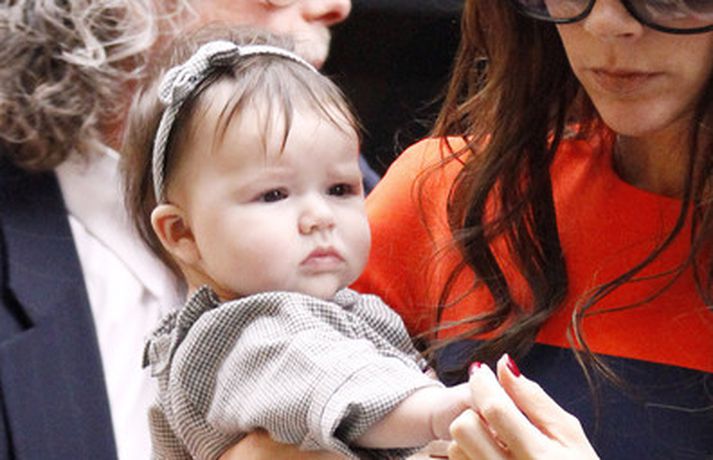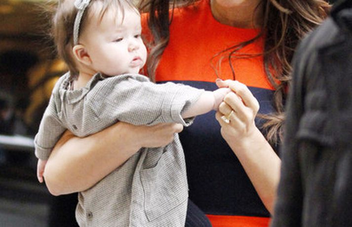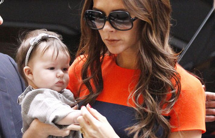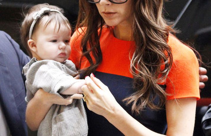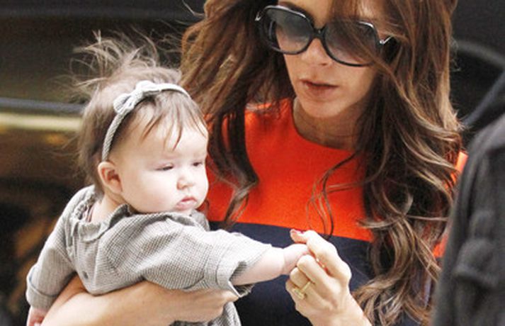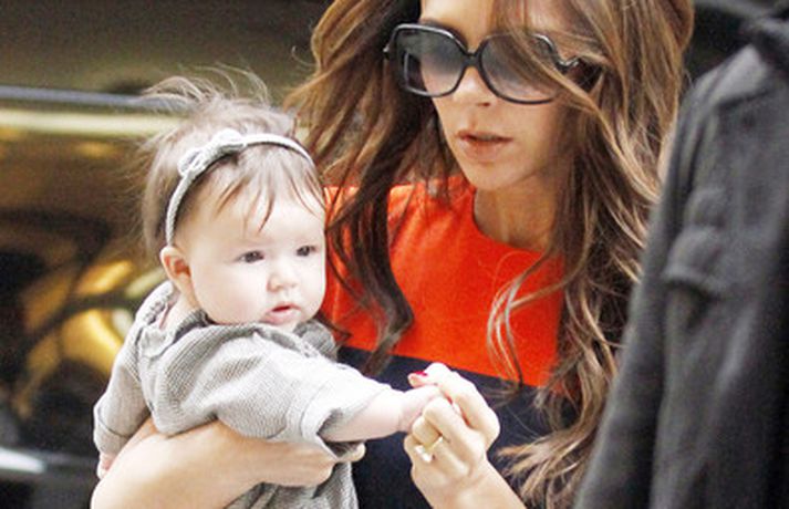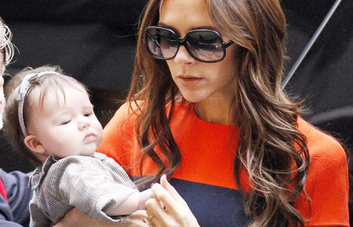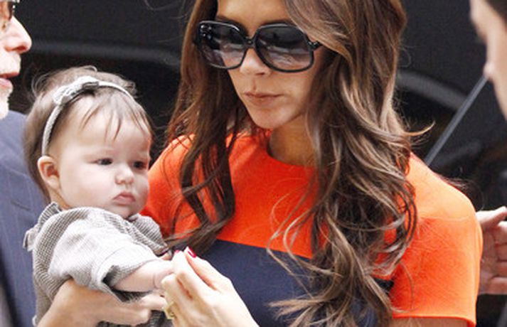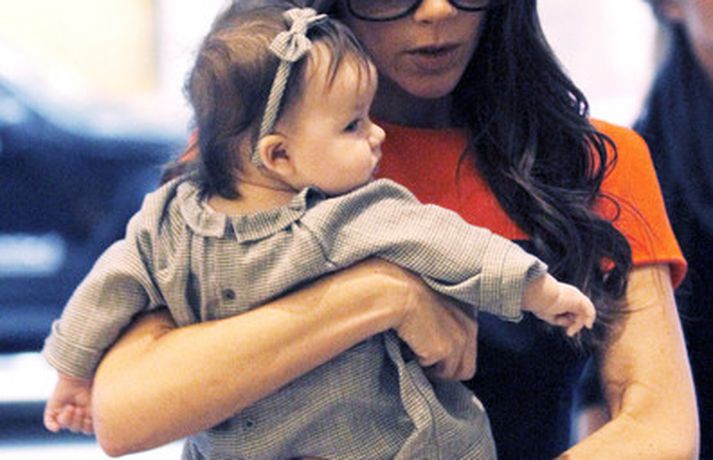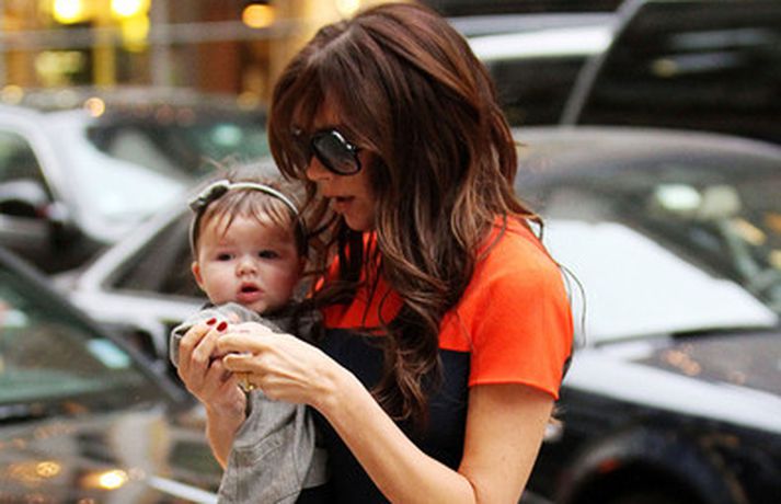 Victoria Beckham, 37 ára, hélt þéttingsfast á stelpunni sinni, Harper, á leið þeirra á Nobu veitingahúsið í New York í gær. Fyrr sama dag fóru mæðgurnar í verslunarleiðangur.