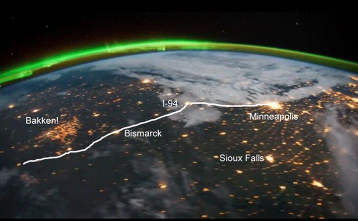 Hér sést Bakken-svæðið borið saman við aðrar borgir á svæðinu.mynd/midwestenerynews.com Ótrúlegt myndband sem tekið var úr Alþjóðlegu geimstöðinni, ISS, sýnir dularfulla borg í Norður-Dakóta í Bandaríkjunum. Í myndbandinu er beitt svokallaðri líðandi myndatöku (e. time-lapse) og sést jörðin upplýst af borgum. Norður- og suðurljós jarðar sjást einnig í allri sinni dýrð. Hægt er að sjá myndbandið hér. En einn árvökull áhorfandi tók eftir undarlegum ljósum í norður-Ameríku. Í miðvesturríkjum Bandaríkjanna sjást borgir eins og Bismarck og Minneapolis upplýstar. Einn upplýstur blettur tilheyrir þó ekki neinni þekktri byggð. Ken Paulman hóf rannsókn á ljósunum undarlegu og komst að því að þau tilheyra risavaxinni olíulind. Svæðið er kallað Bakken og er í Norður-Dakóta. Olíusvæðið er eitt það stærsta í heimi og þekur rúmlega 500.000 ferkílómetra í Norður-Dakóta og Montana-fylki - ásamt því að teygja sig yfir landamærin til Kanada. Ljósin sem sjást á myndbandinu orsakast vegna blossa sem myndast vegna jarðgass og logandi pústra sem létta á þrýstingi vinnutækja olíulindarinnar.