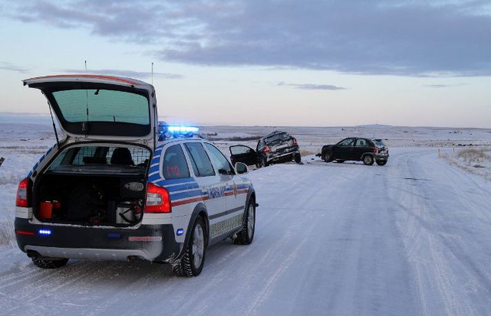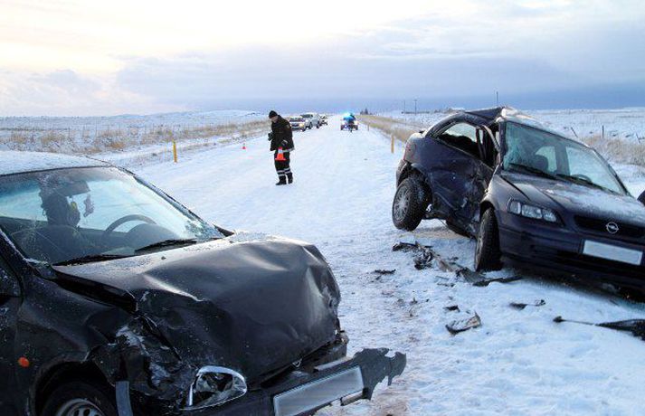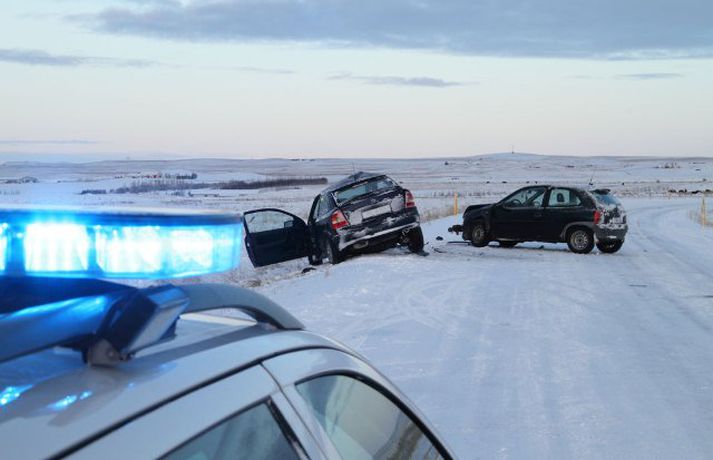 Harður árekstur varð við Landvegamótum á þriðja tímanum í dag. Ökumenn beggja bílanna voru fluttir á slysadeild í Reykjavík. Ekki er vitað nákvæmlega hversu alvarlega þeir slösuðust. Áreksturinn virðist hafa verið mjög harður. Þetta er þriðja umferðaróhappið í dag sem fréttastofa Stöðvar 2 og Vísis fær upplýsingar um. Tveir bílar fóru út af veginum við Skíðaskálann í Hveradölum í dag. Full ástæða er fyrir ökumenn að fara varlega þegar ekið er. Í meðfylgjandi myndasafni getur þú séð myndir sem Jóhann Kristinn Jóhannsson tók af störfum lögreglumanna á vettvangi.