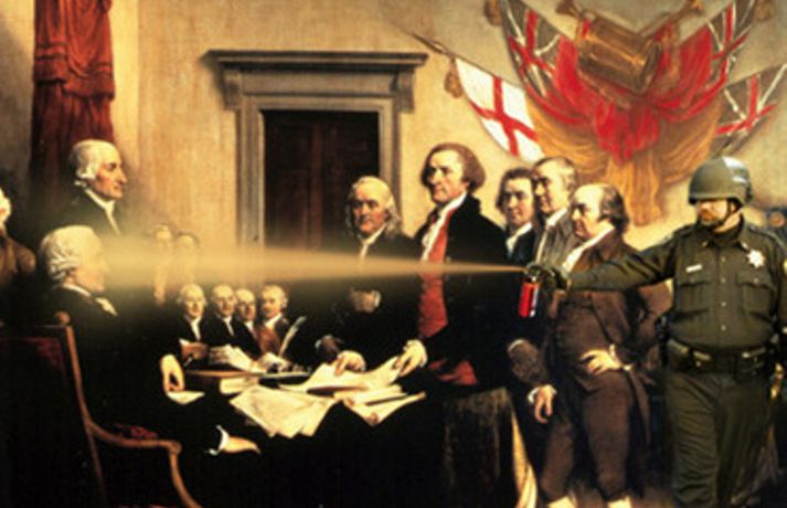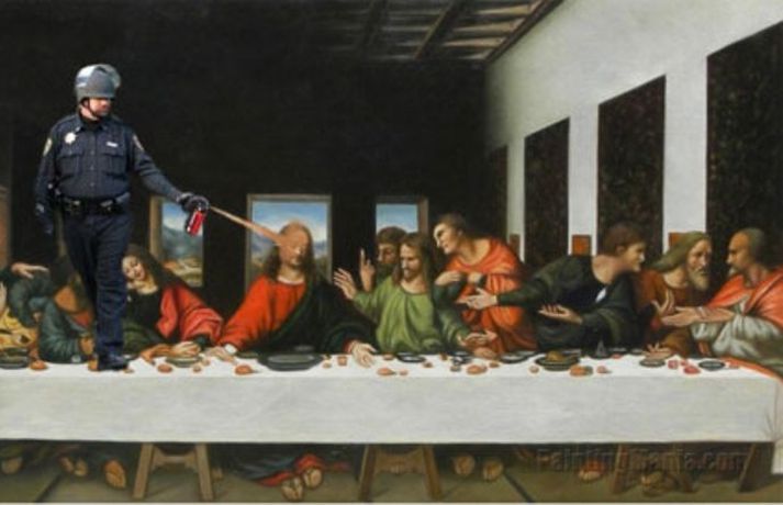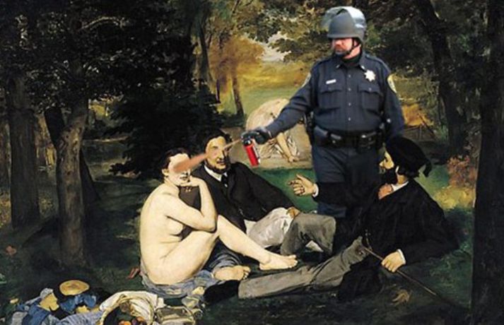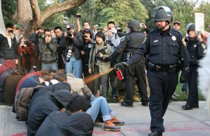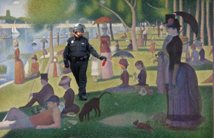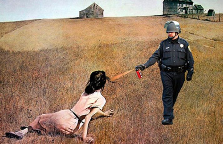 Gaslöggu vikið frá störfum - slær í gegn á Netinu 22. nóvember 2011 10:16 Lögreglustjórinn á stúdentagörðunum við UC Davis háskólann í Kalíforníu hefur verið leystur tímabundið frá störfum ásamt tveimur undirmönnum sínum. Ástæðan er óhófleg notkun á piparúða þegar lögreglumennirnir reyndu að leysa upp friðsamleg mótmæli á skólalóðinni á föstudaginn var. Eins og við var að búast var atvikið tekið upp og hefur meðfylgjandi myndband vakið mikla athygli á Internetinu. Þar sést lögreglumaðurinn John Pike fara sér í engu óðslega og spreyja piparúðanum í miklu magni á námsmennina sem sitja með krosslagðar lappir og ógna engum. Þessar aðfarir hafa orðið Netverjum tilefni til þess að taka myndina af lögreglumanninum og setja hann í alls kyns aðstæður þar sem ólíklegusta fólk verður fyrir barðinu á honum. Dæmi um það má sjá í meðfylgjandi myndaalbúmi. Mest lesið Í deilum við nágrannann vegna trjáa Erlent Tvær þyrlur sækja fjóra eftir alvarlegan árekstur á Fagurhólsmýri Innlent Trump telur friðarsamkomulag mögulegt innan nokkurra vikna Erlent Ferðakostnaður forsetans rúmar tuttugu milljónir Innlent „Gamla góða Ísland, bara betra“ Innlent Sakamálin sem einkenndu árið sem er á enda Innlent Tilhæfulaus líkamsárás í annað sinn og enginn kom til aðstoðar Innlent Ekki boðlegt að þingið hunsi þjóðaratkvæðagreiðslu Innlent „Þetta er ansi flókið, en þó ekki svo flókið“ Erlent Minnst einn látinn eftir að tvær þyrlur rákust saman í loftinu Erlent Fleiri fréttir Tvær þyrlur sækja fjóra eftir alvarlegan árekstur á Fagurhólsmýri „Rúllandi rafmangsleysi“ alla daga og tífaldur þungi í árásum „Gamla góða Ísland, bara betra“ Gróður farinn að grænka fyrir norðan Ferðakostnaður forsetans rúmar tuttugu milljónir Sakamálin sem einkenndu árið sem er á enda Ekki boðlegt að þingið hunsi þjóðaratkvæðagreiðslu Margfaldur þungi í loftárásum og kyntákn kveður Afbrot, fjölmiðlastyrkir og stefna Miðflokksins Segir dulda skattahækkun taka gildi á næsta ári Líkamsárás í miðbænum Dró konu eftir gangstétt og lyfti henni svo upp með hálstaki Reyndi ítrekað að stofna til slagsmála við skemmtistað Sjálfvirkir lyfjaskammtarar borgi sig tvöfalt til baka Tilhæfulaus líkamsárás í annað sinn og enginn kom til aðstoðar Keyptu aðstoð vegna leiðréttingar landsframlags og hringferðar ráðherra Frumkvæðisvinna lögreglu að loka fjórum afhendingarstöðum „Fara þarf í raunverulegar aðgerðir“ Hrindir af stað söfnun fyrir föður drengsins Kjartan sækist ekki eftir endurráðningu sem bæjarstjóri Landeldi í vexti og lögregla lokar áfengisverslunum Árekstur á Suðurlandsbraut Ekki talinn tengjast aukinni eldvirkni Handteknir grunaðir um framleiðslu fíkniefna Jarðskjálfti við Kleifarvatn Lögreglumenn eltu lausa hesta Lögregla lokaði Smáríkinu og Nýju vínbúðinni Stöðvuðu menn í ofbeldishug við landamærin Piltur skilinn eftir ber að ofan og skólaus eftir hrottafengna árás Dæmdur fyrir líkamsárás í matsalnum Sjá meira