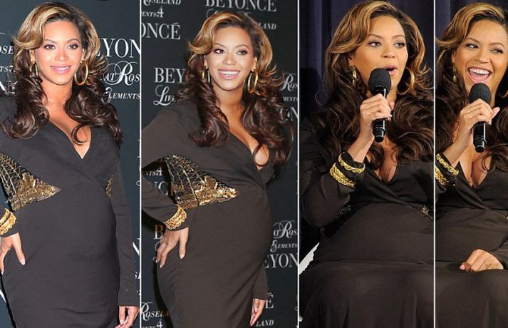 Söngkonan Beyonce Knowles, 30 ára, stillti sér upp á rauða dreglinum í Roberto Cavalli kjól þegar hún kynnti nýja DVD diskinn sinn Beyonce: Live at Roseland þar sem hún rifjar upp eigin feril frá upphafi.Eins og sjá má á myndunum er Beyonce greinilega með barni en óléttan hennar hefur hugsanlega verið eitt umtalaðasta viðfangsefni slúðurmiðla undanfarnar vikur. Því hefur verið haldið fram að staðgöngumóðir tæki að sér að ganga með barnið til að hlífa líkama Beyonce en söngkonan hefur ávallt harðneitað því.