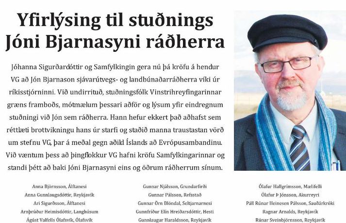 Vel á annað hundrað manns úr röðum Vinstri grænna birta heilsíðuauglýsingu í dagblöðunum í morgun þar sem lýst er yfir eindregnum stuðningi við Jón Bjarnason landbúnaðar- og sjávarútvegsráðherra. Í yfirskrift er fullyrt að Jóhanna Sigurðardóttir forsætisráðherra geri þá kröfu að hann víki úr ríkisstjórninni. Þeir sem birta nöfn sín í auglýsingunni vænta þess hinsvegar að þingflokkur Vinstri grænna hafni þeirri kröfu Samfylkingarinnar og standi þétt að baki Jóni, eins og öðrum ráðherrum sinum.