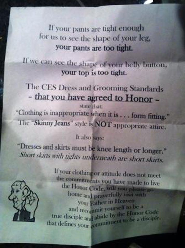 Skólinn tilkynnti um bannið með því að dreifa þessum miða til nemenda sinna.mynd/Student Review Háskóli í Idaho í Bandaríkjunum íhugar nú að leyfa þröngar buxur á ný eftir að hafa bannað þær með öllu. Nemendur skólans lýstu óánægju sinni með bannið á samskiptasíðum. Þegar nemendur skólans mættu í próf fyrr vikunni var þeim tilkynnt að þröngar buxur yrðu ekki leyfðar í prófstofunni. Ástæðuna má rekja til siðareglna skólans en þar kemur fram að nemendur verði að sína hógværð í klæðaburði. Nemendum er einnig bannað að klæðast fötum sem sýna of mikið hold -þar á meðal eru ermalausir bolir og pils sem ekki ná niður fyrir hné. Sumir stúdentar í Brigham Young háskólanum eru þó ánægðir með bannið og fagna því að stúlkur þurfi nú að klæðast eðlilegum fötum. Ritstjóri skólablaðsins, Rachel Taylor, sagði að sumir nemendur klæddust buxum sem væru hreinlega of þröngar. Eftir að nemendur skólans mótmæltu banninu á samskiptasíðum ákváðu stjórnendur skólans að endurskoða málið. Í dag barst síðan yfirlýsing frá háskólanum þar sem þröngar buxur eru sagðar vera móðgandi en þó ekki alslæmar.