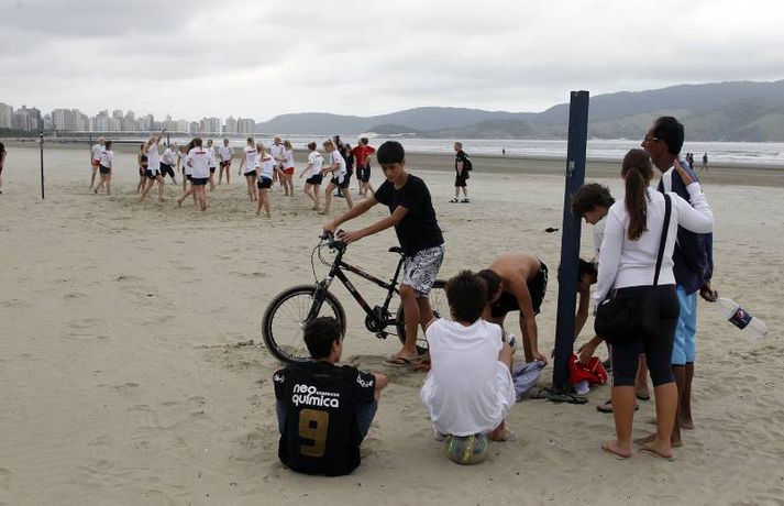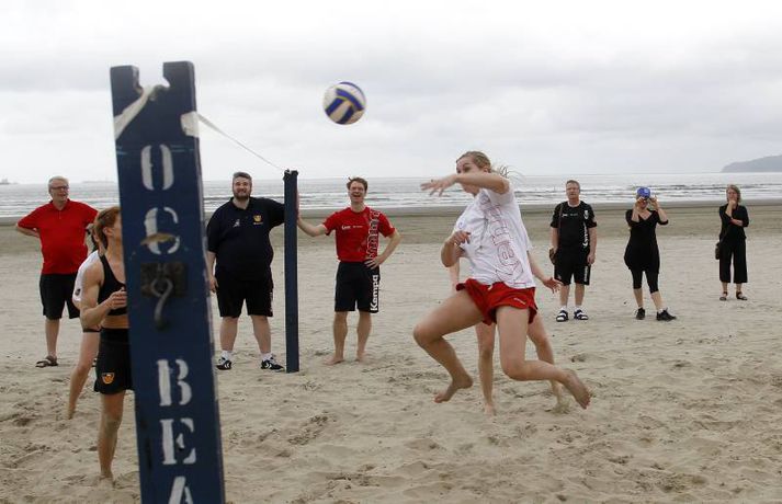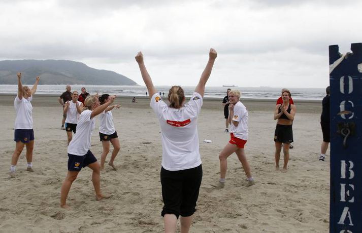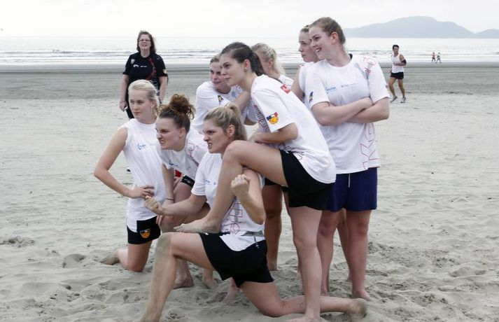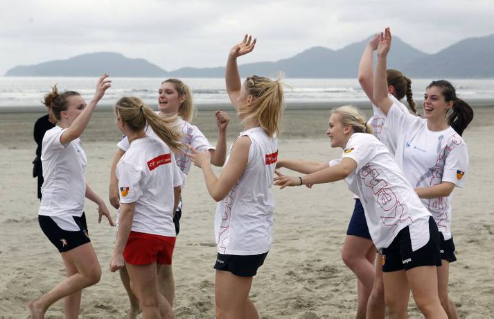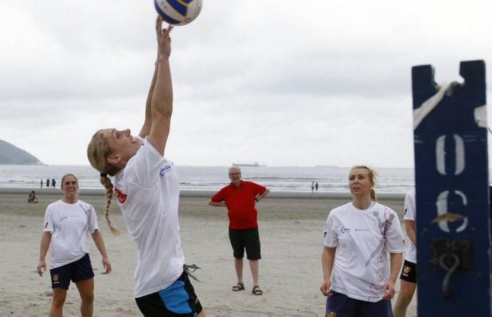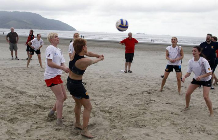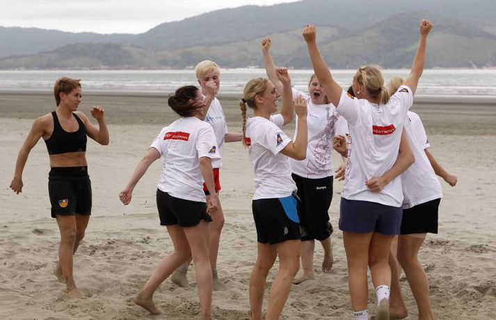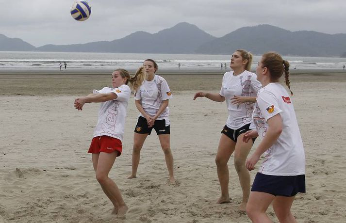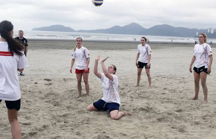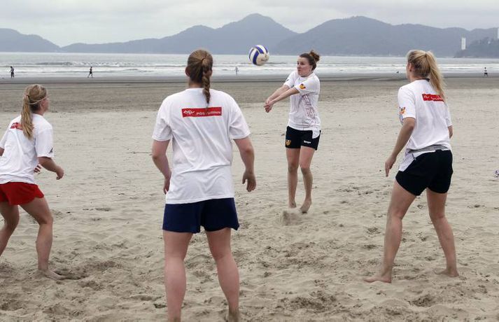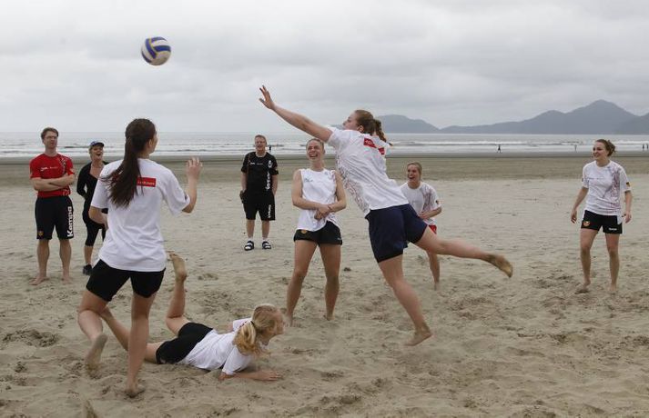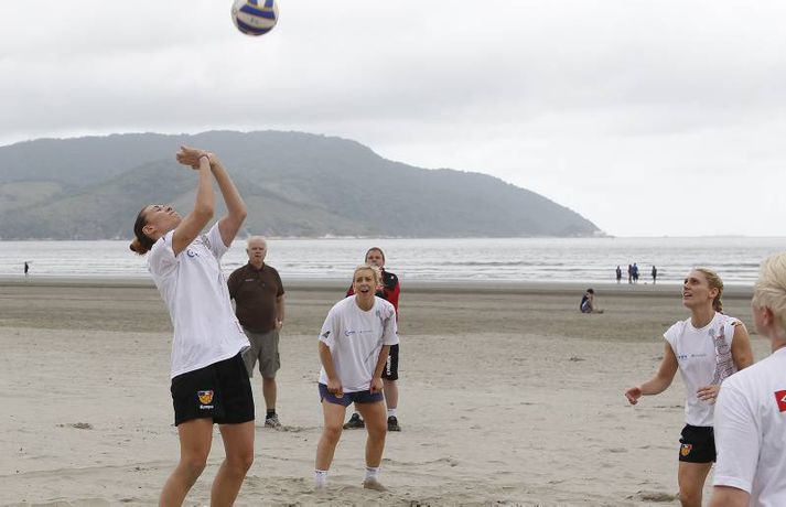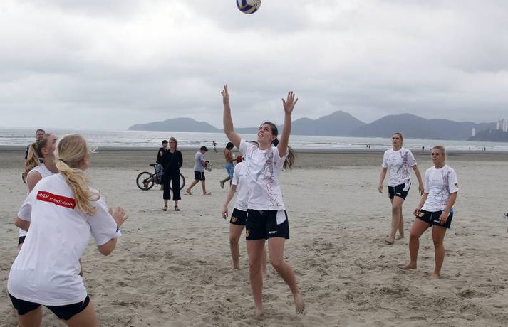 Leikmenn kvennalandsliðs Íslands í handbolta nýttu frídaginn á HM í Brasilíu í gær til að lyfta sér aðeins upp og skelltu þær sér í strandblak í góða veðrinu. Eins og venja er var skipt í tvö lið, ungir og gamlir, en með þessu var verið að reyna að breyta til og gera eitthvað annað en þær höfðu gert eftir komuna til Brasilíu í síðustu viku. Æfingin hófst með því að hlaupa á ströndinni til að hita upp, svo var farið í strandblak áður en stelpurnar skelltu sér í sjóinn. Höfðu menn mjög gaman að. Pjetur Sigurðsson, ljósmyndari Vísis og Fréttablaðsins, hefur fylgst vel með HM kvenna í Brasilíu og tók þessar myndir í gær.Mynd/Pjetur