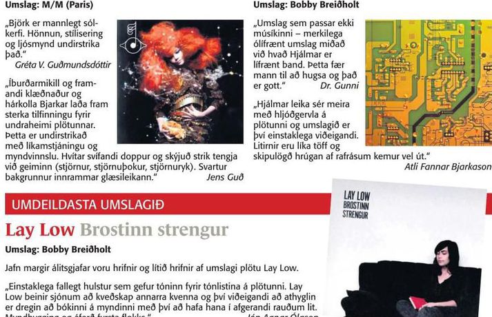 Að gömlum og góðum sið fékk Fréttablaðið hóp valinkunnra andans manna til að velta fyrir sér kostum og göllum íslenskra plötuumslaga sem komið hafa út á árinu. Fjölmörg umslög voru nefnd til sögunnar og niðurstöðurnar gefur að líta hér í meðfylgjandi myndasafni.