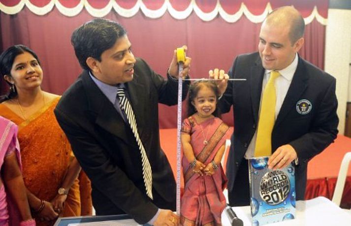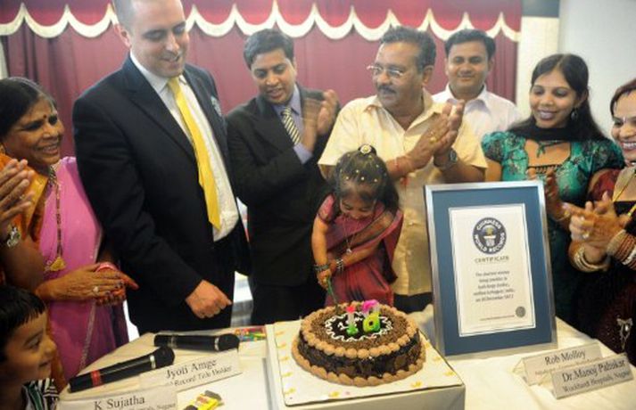 Hin smávaxna Jyoti Amge fagnaði 18 ára afmælisdegi sínum í dag. Dagurinn hefur þó sérstaka þýðingu fyrir Jyoti því hún var formlega nefnd minnsta kona veraldar. Fulltrúar heimsmetabókar Guinnes mættu á heimili Jyoti og mældu hæð hennar. Þeir staðfestu það sem í raun var vitað - Jyoti er minnsta kona veraldar. Þetta er ekki í fyrsta sinn sem nafn hennar er skrá í heimsmetabókina því áður en hún varð lögráða einstaklingar var hún skráð sem minnsti unglingur veraldar. Jyoti er 62.8 sentímetrar að hæð og vegur rúmlega 5 kílógrömm. Hún þjáist af sjaldgæfum hrörnunarsjúkdómi sem leiddi til þess að líkami hennar hætti að stækka ári eftir að hún fæddist. Þrátt fyrir veikindi sín er Jyoti nokkuð venjulegur einstaklingar. Hún hefur ánægju af því að versla með vinkonum sínum og að horfa á kvikmyndir. Aðspurð um drauma sína og vonir sagðist hún ætla að verða leikkona í Bollywood kvikmyndum.