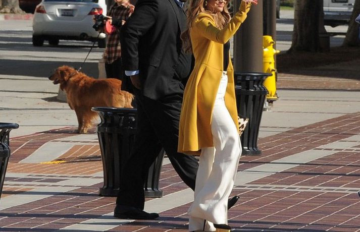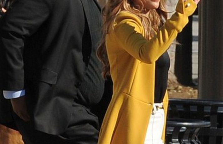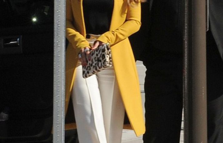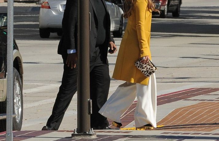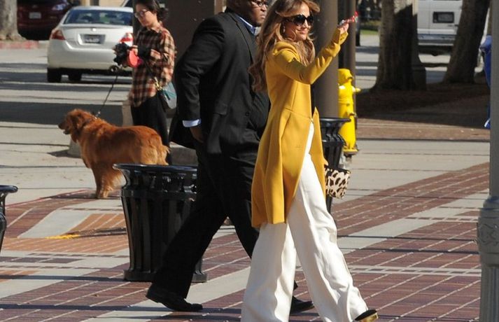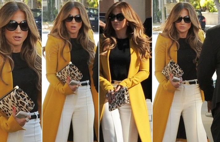 Söng- og leikkonan Jennifer Lopez, 42 ára, mætti í fylgd lífvarðar í vinnuna sem American Idol dómari. Áheyrnarprófin fyrir næstu sjónvarpsseríu American Idol, sem hefst 18. janúar næstkomandi, eru hafin. Karrýgul kápan hennar og urrandi veski, sem skoða má í meðfylgjandi myndasafni, vöktu verðskuldaða athygli.