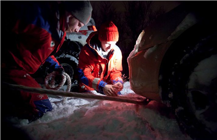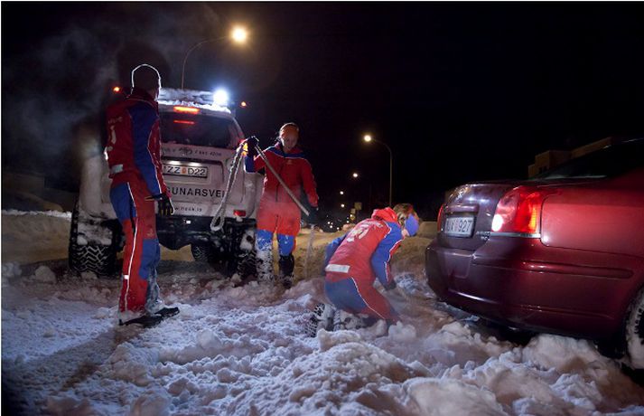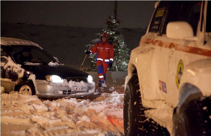 Þeir sem muna ekki eftir annarri eins snjókomu í desember, hafa á réttu að standa, en samkvæmt upplýsingum frá Veðurstofu Íslands mældist snjódýptin í morgun 33 sentímetrar. Það er semsagt met. Það hefur aldrei snjóað jafn mikið á einum degi í desember frá því mælingar hófust árið 1921. Veðurstofan spáir éljagangi áfram í dag. Á morgun breytist veðrið hinsvegar nokkuð. Það mun snjóa til að byrja með, svo verður slydda og að lokum fer að rigna seinni partinn á föstudaginn. Svo er búist við því að það hlýni nokkuð. Þannig ættu allar tölur að vera rauðar á láglendi Íslands á gamlársdag. Fleiri veðurmet hafa verið slegin í desember. Snjór hefur nú legið yfir höfuðborgarsvæðinu og nágrenni þess samfleytt frá 26. nóvember. Aldrei áður frá upphafi mælinga hefur snjór verið samfleytt svo lengi á fyrri hluta vetrar. Eins og fram hefur komið hafa björgunarsveitamenn staðið í stórræðum í nótt og í morgun og hér að neðan má sjá myndir frá starfi þeirra.