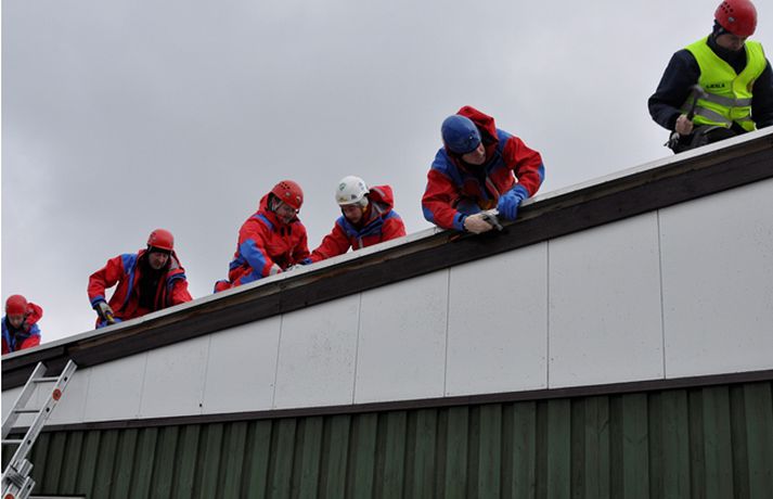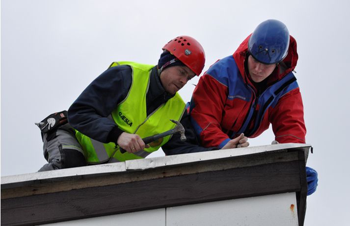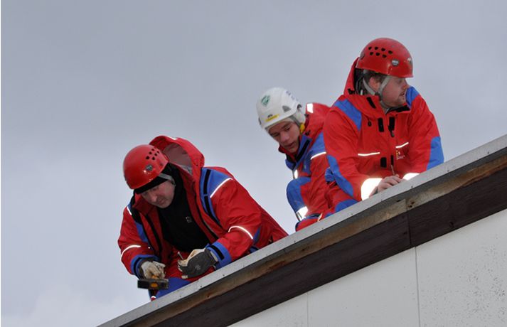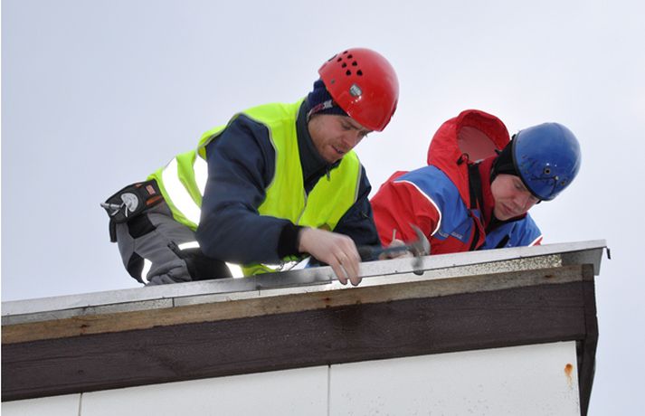 Þakplötur fuku af Rauðagerði Jón Hákon Halldórsson skrifar 24. desember 2011 14:53 Björgunarmenn festa þakplötur á Rauðagerði. mynd/ óskar friðriksson Þakplötur voru byrjaðar að losna af Rauðagerði við Boðaslóð í Vestmannaeyjum eftir hádegið í dag. Björgunarfélaginu í Vestmannaeyjum barst tilkynning um málið klukkan átján mínútur í tvö og fóru umsvifalaust á staðinn. Óskar Friðriksson, fréttaritari Fréttablaðsins í Vestmannaeyjum, fékk þær upplýsingar að greiðlega hefði gengið að festa plöturnar aftur. Vindur á Stórhöfða hefur farið upp í allt að 28-30 metra á sekúndu af vestan og norð-norðvestan. Borist hafa að minnsta kosti fimm til sex útköll um að þakplötur væru farnar að losna og ljóst er að tjón er orðið nokkuð. Þegar litið er á landið allt er ljóst að töluvert hefur verið um útköll björgunarsveita Slysavarnafélagsins Landsbjargar í dag. Sú veðurspá sem Veðurstofan spáði hefur gengið eftir þar sem veður hefur versnað til muna núna eftir hádegi. Auk Björgunarsveitarinnar í Vestmannaeyjum eru björgunarsveitir á Suðurlandi og á Reykjanesi núna að störfum við að aðstoða bíla sem lent hafa út af vegum vegna hálku og hvassviðris en einnig við að festa niður hluti sem hafa farið af stað vegna veðurs. Slysavarnafélagið Landsbjörg hvetur landsmenn til að leggja ekki í ferðalög meðan veðrið gengur yfir og fylgjast vel með veðurspá. Á meðfylgjandi myndum má sjá björgunarsveitamenn að störfum við Rauðagerði. Mest lesið Piltur skilinn eftir ber að ofan og skólaus eftir hrottafengna árás Innlent Engir ælupokar notaðir, þetta var núllpokaflug Innlent Dæmdur fyrir líkamsárás í matsalnum Innlent Hafði komið sér fyrir á háalofti hótels Innlent Tap upp á 130 milljónir og neikvætt eigið fé upp á aðrar 26 Innlent Þau kvöddu á árinu 2025 Erlent Töpuðu tæpum hundrað milljónum Innlent Fyrirskipaði árásir á „hryðjuverkaúrhrök“ í Nígeríu Erlent Kuldaskil á leið yfir landið Veður Komst ekki á toppinn og bótakröfunni hafnað Neytendur Fleiri fréttir Piltur skilinn eftir ber að ofan og skólaus eftir hrottafengna árás Dæmdur fyrir líkamsárás í matsalnum Engir ælupokar notaðir, þetta var núllpokaflug Hafði komið sér fyrir á háalofti hótels Tap upp á 130 milljónir og neikvætt eigið fé upp á aðrar 26 Umferðin róleg í kirkjugörðunum Töpuðu tæpum hundrað milljónum Milljónir í sekt fyrir að bakka á konu Þörf á að skerpa á verklagi spítalans í heimilisofbeldismálum Engin jólamessa vegna rafmagnsleysis Klæðning fauk af Stjórnsýsluhúsinu og skemmdi bíla Gleðileg jól, kæru lesendur Einn fluttur á sjúkrahús eftir bílslys Skiluðu hagnaði á kosningaári Hátíðarveisla á kaffistofu Samhjálpar: „Það er ró og friður yfir fólki“ Björgunarsveitin kölluð út í fokverkefni Grjóthrun undir Eyjafjöllum Fátækari eftir að hafa svindlað á ferðakonum Arion banki varar við svikaherferð Innanlandsflugi aflýst Foreldrar skipverjans fá áheyrn í Hæstarétti Hvar er opið á aðfangadag? Innflytjendamálin almenningi efst í huga Bæta við allt að 200 íbúðum og mathöll í Spöngina Maður í umferðarslysi reyndist fíkniefnasali Minni rekstrarkostnaður fyrir eigendur bensínháka Hafnar „jólakveðju“ ríkisins Hefði þurft hjólbörur undir öll verðlaunin sín Ýmis ráð til taugatrekktra á Þorláksmessu Ekkert því til fyrirstöðu að Ásthildur Lóa verði aftur ráðherra Sjá meira