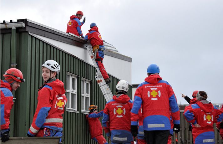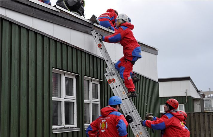 Þakplötur voru byrjaðar að losna af Rauðagerði við Boðaslóð í Vestmannaeyjum eftir hádegið í dag. Björgunarfélaginu í Vestmannaeyjum barst tilkynning um málið klukkan átján mínútur í tvö og fóru umsvifalaust á staðinn. Óskar Friðriksson, fréttaritari Fréttablaðsins í Vestmannaeyjum, fékk þær upplýsingar að greiðlega hefði gengið að festa plöturnar aftur. Vindur á Stórhöfða hefur farið upp í allt að 28-30 metra á sekúndu af vestan og norð-norðvestan. Borist hafa að minnsta kosti fimm til sex útköll um að þakplötur væru farnar að losna og ljóst er að tjón er orðið nokkuð. Þegar litið er á landið allt er ljóst að töluvert hefur verið um útköll björgunarsveita Slysavarnafélagsins Landsbjargar í dag. Sú veðurspá sem Veðurstofan spáði hefur gengið eftir þar sem veður hefur versnað til muna núna eftir hádegi. Auk Björgunarsveitarinnar í Vestmannaeyjum eru björgunarsveitir á Suðurlandi og á Reykjanesi núna að störfum við að aðstoða bíla sem lent hafa út af vegum vegna hálku og hvassviðris en einnig við að festa niður hluti sem hafa farið af stað vegna veðurs. Slysavarnafélagið Landsbjörg hvetur landsmenn til að leggja ekki í ferðalög meðan veðrið gengur yfir og fylgjast vel með veðurspá. Á meðfylgjandi myndum má sjá björgunarsveitamenn að störfum við Rauðagerði.