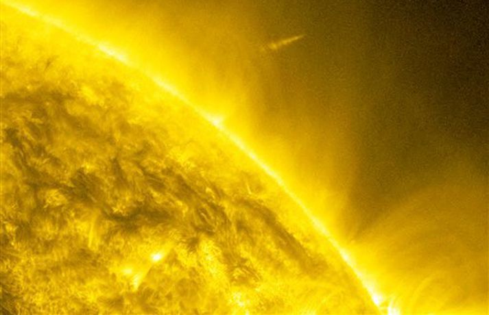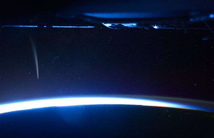 Náði ótrúlegum myndum af halastjörnunni Lovejoy 23. desember 2011 21:30 Geimfarinn Dan Burbank náði stórkostlegum myndum af halastjörnunni Lovejoy stuttu eftir að hún átti náin kynni við sólina. Burbank lýsti því sem einu stórfenglegasta augnabliki lífs síns þegar hann sá Lovejoy skjótast framhjá Alþjóðlegu geimstöðinni. Í síðustu viku fylgdust vísindamenn NASA með Lovejoy er hún steyptist í átt að sólinni og hvarf á bak við hana. Talið er að Lovejoy hafi verið í um 14.000 kílómetra fjarlægð frá yfirborði sólarinnar. Halastjarnan kom síðan öllum að óvörum þegar hún birtist síðan hinum megin við sólina og hélt leið sinni um sólkerfið áfram. Lovejoy var uppgötvuð 27. nóvember á þessu ári var skírð í höfuðið á þeim sem fann hana en það var ástralskur áhugamaður um stjörnufræði að nafni Terry Lovejoy. Mest lesið Banaslys á Hvolsvelli Innlent Vinum hans ekki litist á blikuna Innlent Allt sem þú þarft að vita um nýja kílómetragjaldið Innlent Sumarbústaðaeigendur geti skotið upp flugeldum annars staðar Innlent Karólína Helga býður sig fram gegn sitjandi oddvita Innlent Veki furðu að bílaleigubílar séu ekki á nagladekkjum Innlent Tekur stóra skammta af magnýl og leiðist að hreyfa sig Erlent Fyrsta fórnarlambið nafngreint Erlent Þurfi að sannfæra flokkinn Innlent Telur nær öruggt að fleiri hundar muni týnast Innlent Fleiri fréttir Íranir óttist „Sýrlandsvæðingu“ Vinna með yfirvöldum í níu löndum að bera kennsl á látna Fyrsta fórnarlambið nafngreint Tekur stóra skammta af magnýl og leiðist að hreyfa sig Barist á götum úti í Íran fimmta daginn í röð Segjast hafa sviðsett aftöku og hirt verðlaunaféð af Rússum Fimm daga þjóðarsorg lýst yfir í Sviss Óttast að um fjörutíu hafi látist á skemmtistaðnum Sór embættiseiðinn á niðurlagðri neðanjarðarlestarstöð Kirkja í Amsterdam alelda Tugir látnir eftir sprengingu í svissneskum skíðabæ Kamilla Bretadrottning greinir frá kynferðisofbeldi Dótturdóttir JFK er látin Handtóku 357 meinta ISIS-liða í kjölfar mannskæðra átaka „Sannur Finni“ fær hæli í Rússlandi Sífellt fleiri hermenn falla á ári hverju Hvetur ESB til að svara refsiaðgerðunum Bandaríkjanna fullum hálsi Þrítugasta árásin á bát meintra smyglara TikTok-áskorun leiddi til banafalls af útvarpsmastri Blóðbaðið í El Fasher: Milljón manna borg orðin að „draugabæ“ Neita að ræða við Úkraínumenn vegna meintrar árásar á heimili Pútíns Sádar sprengja hergögn frá furstadæmunum í Jemen og hóta frekari árásum Á lista yfir þrjú hlýjustu ár í mælingasögunni Selenskí sver af sér drónaárás á heimili Pútíns Bandaríkin leggja til tvo milljarða dala með skilyrðum Trump hótar skelfilegum afleiðingum afvopnist Hamas ekki Neita að tjá sig um ummæli Trumps um árás í Venesúela Kim ánægður með nýjar stýriflaugar Þrír lögregluþjónar og sex ISIS-liðar fallnir eftir átök í Tyrklandi Vill lengri tryggingar og tilbúinn til að hitta Pútín Sjá meira