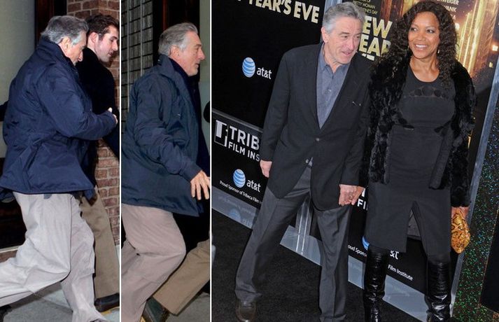 Leikarinn Robert De Niro hljóp eins og fætur toguðu þegar hann yfirgaf byggingu á Manhattan ásamt ónefndum manni eins og sjá má í myndaalbúmi. Ástæðan var fjöldi ljósmyndara sem biðu leikarans fyrir utan. Þá má sjá Robert De Niro ásamt eiginkonu sinni, Grace Hightower, stilla sér upp á rauða dreglinum á frumsýningu kvikmyndarinnar New Year's Eve sem frumsýnd verður í Sambíóunum í dag. Robert fer með eitt af aðalhlutverkunum í myndinni sem er stjörnum prýdd vægast sagt. Sjá nánar hér (sambio.is).