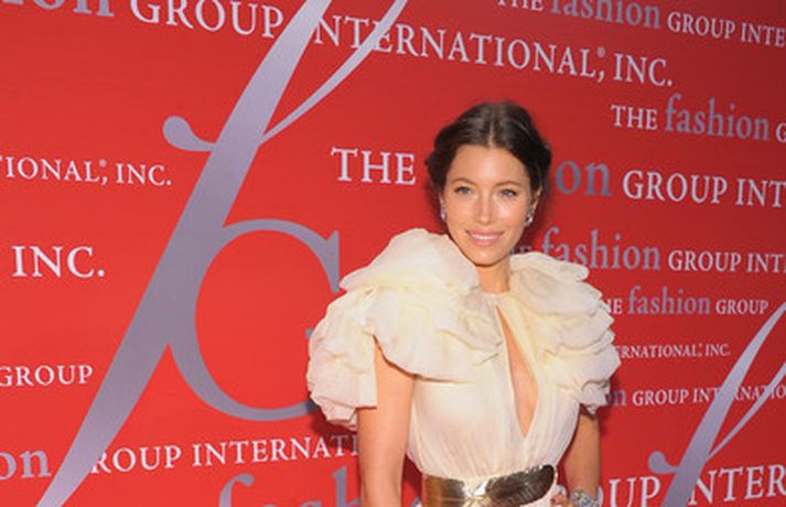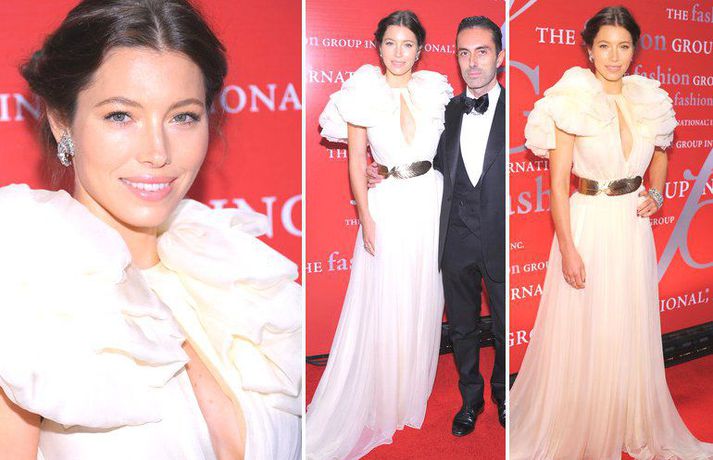 Leikkonan Jessica Biel, 29 ára, stillti sér upp á rauða dreglinum með ítalska fatahönnuðinum Giambattista Valli. Jessica var glæsileg eins og sjá má á myndunum, með uppsett hárið, klædd í ljósan flegin síðkjól, eftir Giambattista, belti og skó og með Fred Leighton skart. Dragðu tarotspil fyrir helginahér.