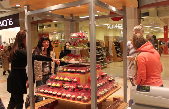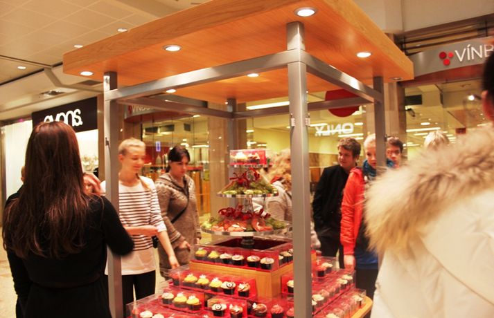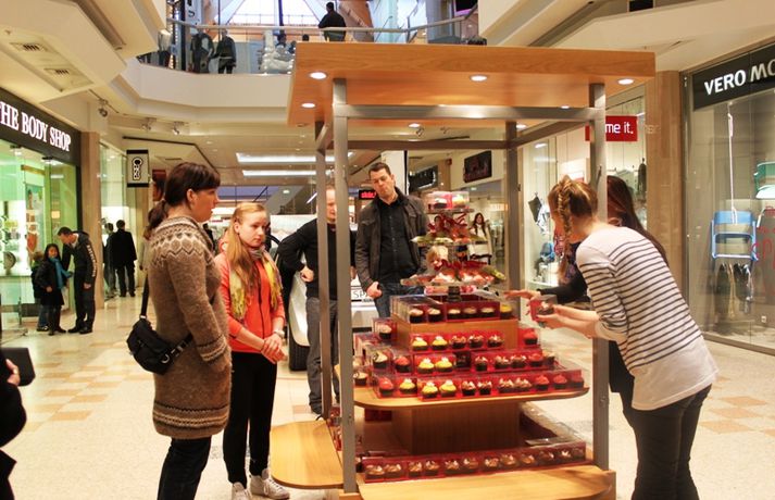 Meðfylgjandi myndir voru teknar í Kringlunni í dag þar sem Friðrika Hjördís Geirsdóttir selur girnilegar ástarkökur í tilefni af Valentinusardeginu fram á mánudaginn næsta. Hluti af söluágóðanum rennur til styrktar Barnaspítala Hringsins og með hverri köku fylgir fallegt ástarljóð eftir afa Friðriku, Geir Gunnar Gunnlaugsson, sem er fallinn frá. Þá segir Friðrika stuttlega frá kökunum í meðfylgjandi myndskeiði.