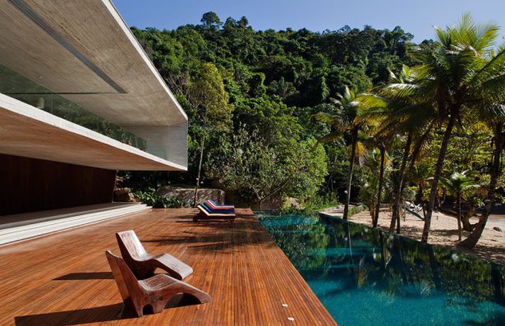 Þetta frábæra partýhús sem skoða má í myndasafni er á eyju rétt úti fyrir strönd Brasilíu stutt frá karnivalborginni, Rio de Janeiro. Byggingu hússins lauk árið 2009 en það gæti hæglega verið hluti af leikmynd úr James Bond mynd frá sjöundaáratug síðustu aldar. Fullkomið partýhús á paradíseyju í Brasilíu. Fallegur arkítektúr fyrir Robinson Crusoe nýtímans.
