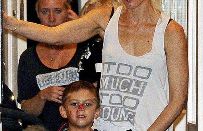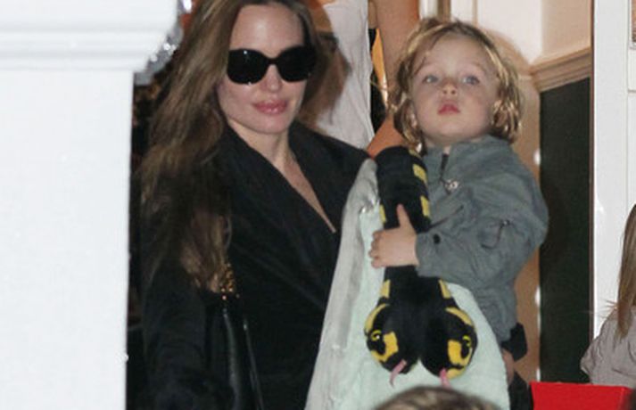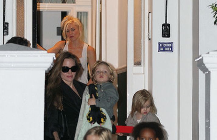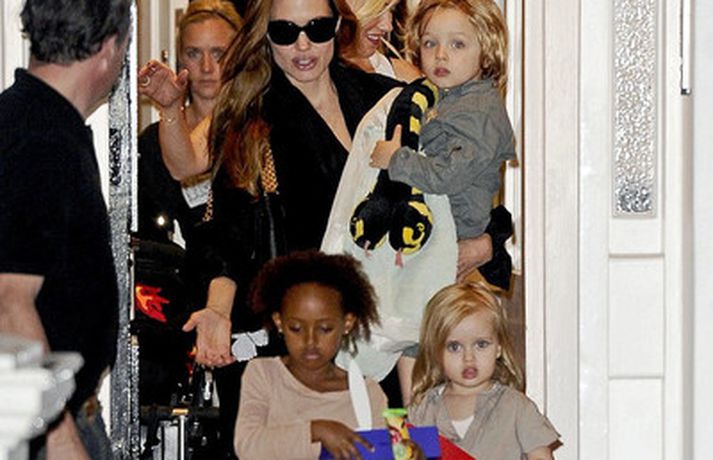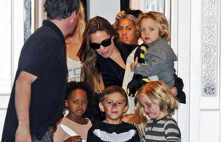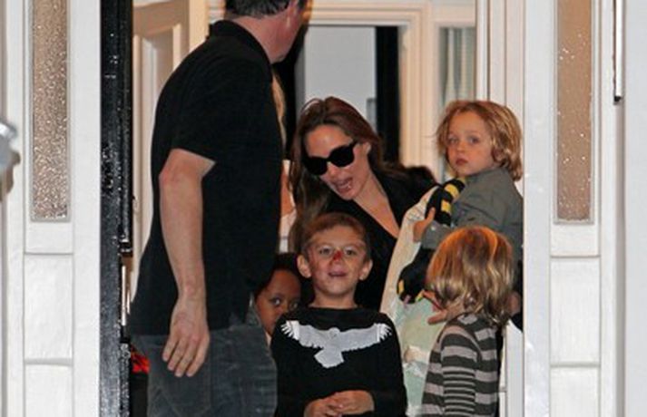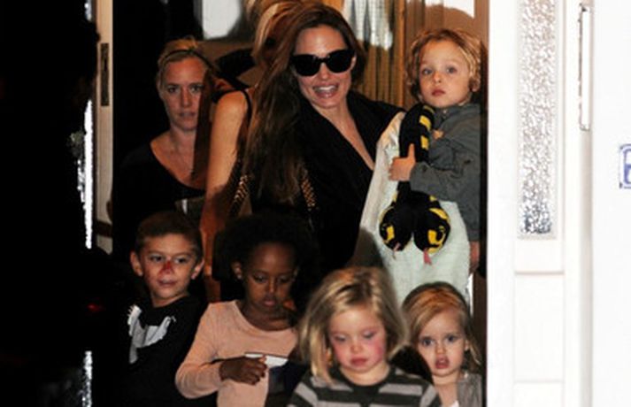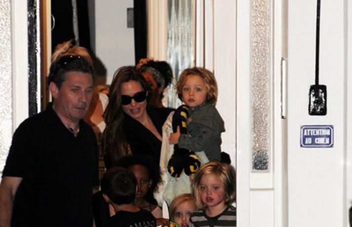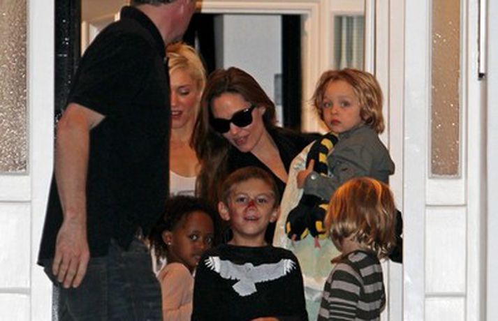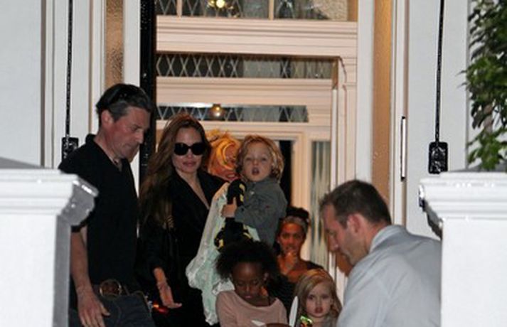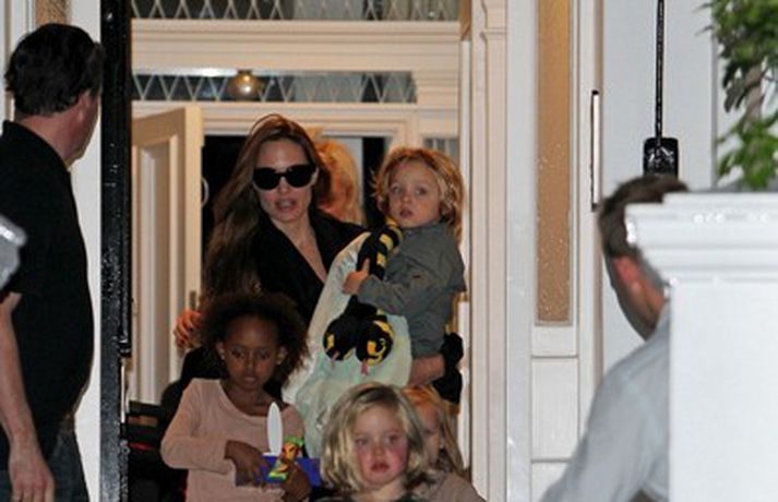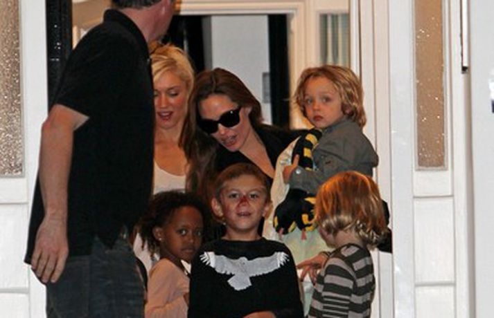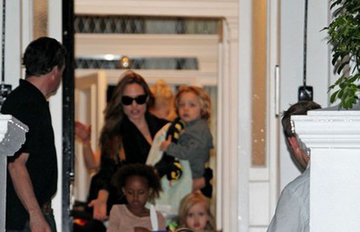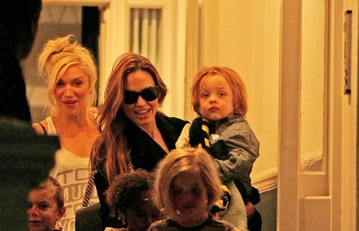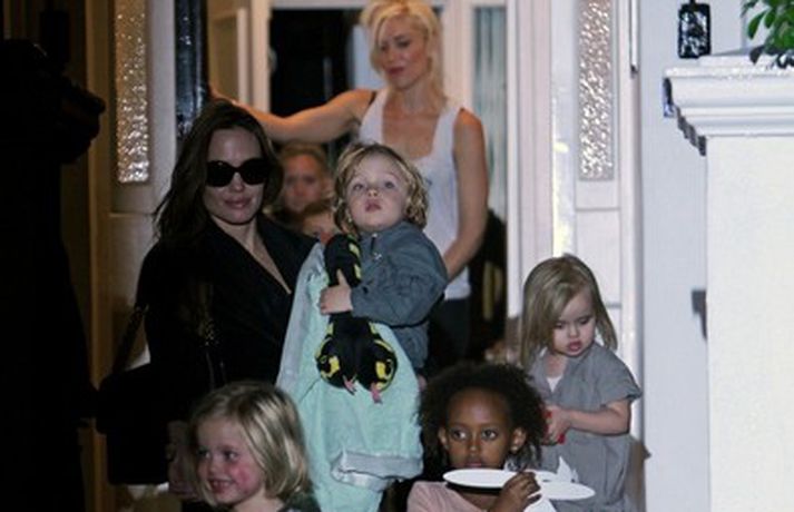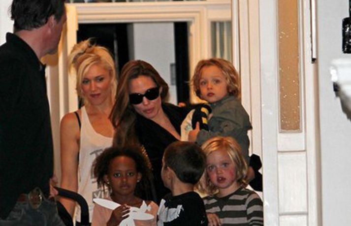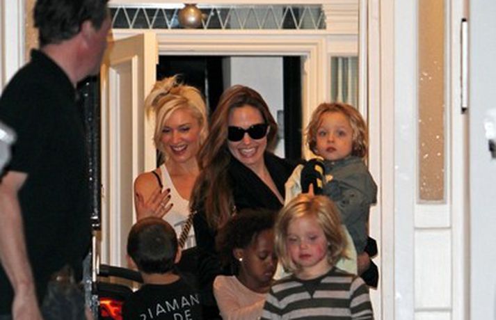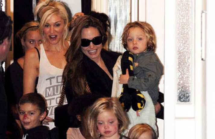 Leikkonan Angelina Jolie, 36 ára, hélt á 3 ára gömlum syni sínum, Knox, þegar hún yfirgaf heimili söngkonunnar Gwen Stefani, 41 árs, í London síðasta mánudag. Með Angelinu voru börnin Shiloh, 5, Zahara, 6, og tvíburasystir Knox, Vivienne. Þá má einnig sjá son Gwen, Kingston, 5.Ef ég læt eins og kjáni eða geri mig að algjöru fífli er öllum slétt sama. Ég hef aldrei verið hrædd við almenningsálitið, lét Angelina hafa eftir sér. Eins og myndirnar sýna leiddist engum.