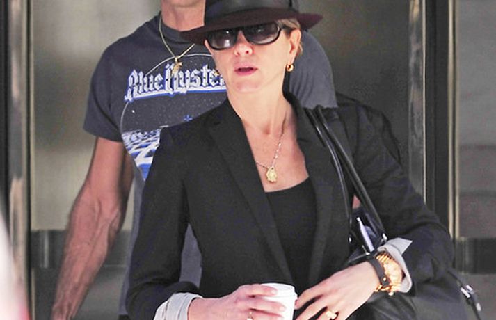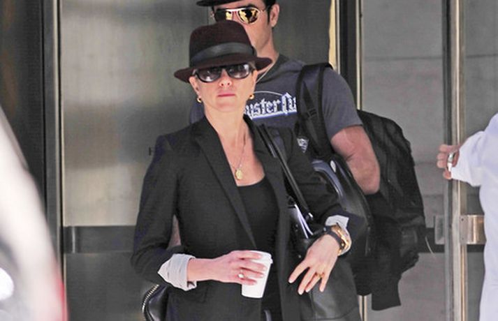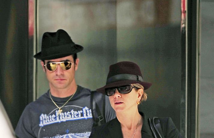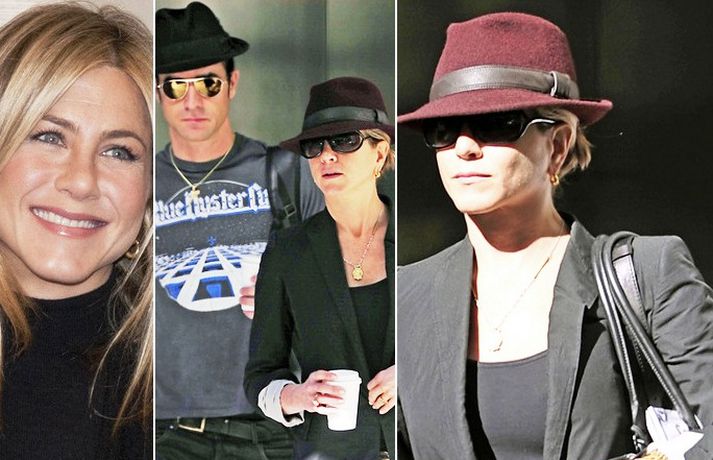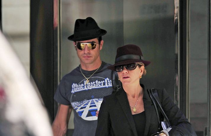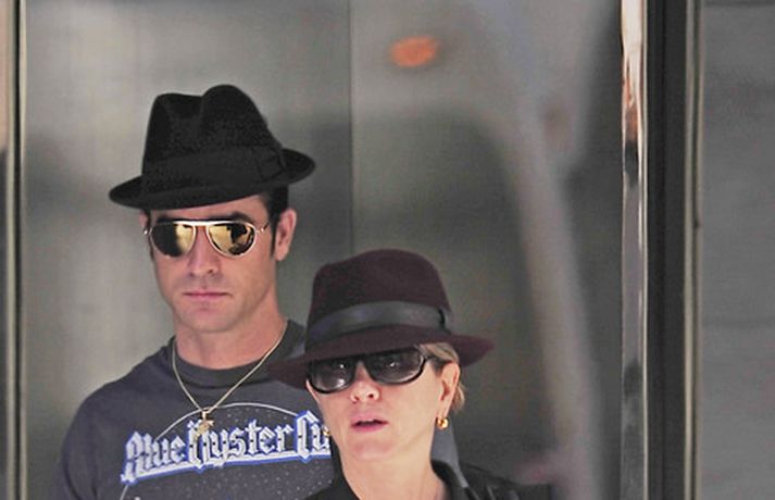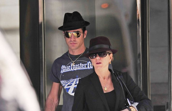 Leikkonan Jennifer Aniston, 42 ára, og unnusti hennar leikarinn Justin Theroux, 40 ára, földu sig bak við hatta og sólgleraugu eins og sjá má á myndunum. Burtséð frá dulargervinu ætlar Justin að biðja föður Jennifer um hönd dóttur hans yfir hátíðarnar. Það gæti reynst erfiðara en hann grunar því Jennifer er ekki enn búin að jafna sig eftir skilnaðinn við leikarann Brad Pitt eftir rúmlega 4 ára hjónaband.Hún á erfitt með að treysta karlmönnum, sagði vinur hennar í viðtali við InTouch tímaritið en á sama tíma þráir hún að stofna fjölskyldu.