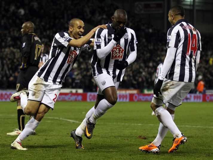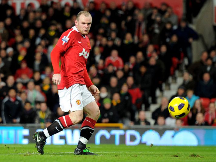 Wayne Rooney með tvö mörk í 3-1 sigri Manchester United Óskar Ófeigur Jónsson skrifar 1. febrúar 2011 21:56 Wayne Rooney fagnar fyrra marki sínu í kvöld. Mynd/Nordic Photos/Getty Manchester United ætlar ekkert að gefa eftir í ensku úrvalsdeildinni og lék í kvöld sinn 29. deildarleik í röð án þess að tapa en 24 leikjanna hafa verið á þessu tímabili. Þetta er jöfnun á félagsmetið og United er því áfram með fimm stiga forskot á Arsenal sem vann einnig sinn leik í kvöld. Wayne Rooney skoraði sína fyrstu tvennu síðan í mars á síðasta ári þegar Manchester United vann 3-1 sigur á Aston Villa á Old Trafford. Þetta var níundi heimasigur United í röð í deildinni en liðið hefur náð í 37 stig af 39 mögulegum í leikhúsi draumanna á þessu tímabili. Wayne Rooney hafði aðeins skorað tvö mörk í fyrstu fjórtán deildarleikjum sínum á þessu tíambili en það er ekki góðar fréttir fyrir hin liðin í toppbaráttunni að Rooney sé kominn í gang á nýjan leik.Mynd/Nordic Photos/GettyÞað tók Manchester United aðeins 50 sekúndur að komast í 1-0. Edwin van der Sar var fljótur að taka aukaspyrnu fyrir framan teiginn sinn og sendi hárnákvæma sendingu inn fyrir á Wayne Rooney sem tók boltann niður og afgreiddi hann glæsilega í markið. Rooney endaði síðan fyrri hálfleikinn eins og hann byrjaði hann þegar hann kom United í 2-0 á 46. mínútu með marki úr markteig eftir frábæran undirbúning frá Nani. Darren Bent minnkaði muninn í 2-1 á 58. mínútu þegar hann skoraði auðveldlega úr markteignum eftir skyndisókn og fyrirgjöf frá Stewart Downing. Rooney lagði síðan upp þriðja markið fyrir Nemanja Vidic sem skoraði með stórglæsilegu skoti utan úr teig á 60. mínútu. United gat bætt við mörkum þar á meðal Wayne Rooney en mörkin urðu ekki fleiri.Marc-Antoine Fortune tryggði West Brom jafntefli í kvöld.Mynd/Nordic Photos/GettyWigan tókst ekki að komast upp úr fallsæti þrátt fyrir að komast yfir á móti West Bromwich Albion í miklum fallbaráttuslag á The Hawthorns, heimavelli West Bromwich í kvöld. West Bromwich tókst að tryggja sér 2-2 jafntefli ellefu mínútum fyrir leikslok. Peter Odemwingie kom heimamönnum yfir í 1-0 strax á 5. mínútu en tvær aukaspyrnur breyttu stöðunni fyrir hálfleik. Charles N'Zogbia fékk aukaspyrnu á vítateigslínunni á 20. mínútu, tók hana sjálfur og skoraði með viðkomu í varnarmanni. Ben Watson kom Wigan síðan í 2-1 á 43. mínútu þegar aukaspyrna hans utan af kanti sigldi alla leið í markið. Marc-Antoine Fortuné jafnaði metin á 79.mínútu eftir fyrirgjöf frá Jerome Thomas. Úrslit og markaskorarar í ensku úrvalsdeildinni í kvöld: Mynd/Nordic Photos/GettyArsenal-Everton 2-1 0-1 Louis Saha (24.), 1-1 Andrei Arshavin (70.), 2-1 Laurent Koscielny (75.)Sunderland-Chelsea 2-4 1-0 Phillip Bardsley (4.), 1-1 Frank Lampard (15.), 1-2 Salomon Kalou (23.), 2-2 Kieran Richardson (26.), 2-3 John Terry (60.), 2-4 Nicolas Anelka (90.+3)Manchester United-Aston Villa 3-1 1-0 Wayne Rooney (1.), 2-0 Wayne Rooney (45.+1), 2-1 Darren Bent (58.), 3-1 Nemanja Vidic (63.)West Bromwich-Wigan 2-2 1-0 Peter Odemwingie (5.), 1-1 Charles N'Zogbia (20.), 1-2 Ben Watson (43.), 2-2 Marc-Antoine Fortuné (79.) Mest lesið Yfirgefur Keflavík vegna komu Martins Körfubolti Ótrúleg tölfræði Jokic Körfubolti Enn kvarnast úr liði Blika Íslenski boltinn Hafnaði 34 milljónum: „Vil ekki styðja kerfi sem býr til fíkn og eyðileggur líf“ Sport Segir starfið í húfi hjá Alfreð Handbolti „Ég mun ekki keppa við Rússa á meðan stríð er í gangi“ Sport Jafnt í stórleiknum Fótbolti Gray hetja Tottenham Enski boltinn Jöfnuðu 128 ára gamalt met Enski boltinn Spennutryllir eftir tvö burst Sport Fleiri fréttir Jöfnuðu 128 ára gamalt met Gray hetja Tottenham Calvert-Lewin skoraði í sjötta leiknum í röð Andy Carroll mætir fyrir dóm eftir að hafa verið handtekinn Villa kvartar til Chelsea vegna flösku sem flaug á bekkinn Sjáðu magnaða vörslu Raya: „Þetta var stórkostlegt“ Sjáðu fyrsta mark Wirtz, laglega sjálfsmarkið og Watkins stúta Chelsea Liverpool-skotmarkið ekki á förum í janúar Aldrei spilað þarna en sagði strax já „Viss um að ég myndi skora einn daginn“ Watkins hélt ótrúlegri sigurgöngu Villa áfram Schade og Jiménez sendu Brentford og Fulham í efri hlutann Arsenal aftur á toppinn Fyrsta mark Wirtz í þriðja sigrinum í röð Cherki aðalmaðurinn í sigri City Úlfarnir heiðruðu minningu Jota Andri Lucas frá í mánuð Sjáðu dönsku þrumuna sem færði United-mönnum öll þrjú stigin Segir að Arsenal stefni á sögulega fernu á þessu tímabili Amorim endaði viðtalið á gamansömum nótum „Við eigum heima í Evrópu“ Daninn skaut Man. United upp fyrir Liverpool Amorim segir strákinn í frystinum vera framtíðin hjá Man. United Martinez með fyrirliðabandið og báðir Fletcher-bræðurnir á bekknum Havertz gæti snúið aftur á næstu dögum Alfons og Willum sáu tvö rauð spjöld fara á loft Synir Diogo Jota leiða leikmenn út á Anfield Cunha vill skemmta og Howe treystir leikmönnum United horfir til Þýskalands eftir höfnun Semenyo Haaland stóðst vigtun eftir jólin Sjá meira