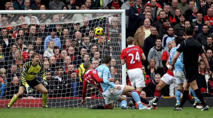 Stórbrotið sigurmark hjá Rooney í Manchester-slagnum Óskar Ófeigur Jónsson skrifar 12. febrúar 2011 14:42 Wayne Rooney fagnar sigurmarki sínu með Nani. Mynd/Nordic Photos/Getty Wayne Rooney tryggði Manchester United 2-1 sigur á nágrönnunum í Manchester City með stórbrotnu marki í leik liðanna á Old Trafford í dag. Nani skoraði fyrra markið og lagði upp það síðara en United náði með þessum sigri sjö stiga forskoti á Arsenal sem mætir Wolves seinna í dag. Wayne Rooney skoraði aðeins tvö mörk í fyrstu fjórtán deildarleikjum tímabilsins en hefur nú skorað þrjú mörk í síðustu þremur leikjum sínum með United. Manchester City byrjaði vel og David Silva fékk dauðafæri strax á 4. mínútu eftir undirbúing Carlos Tevez en skaut framhjá markinu. Manchester City liðið spilaði fyrri hálfleikinn lengstum vel en það var hinsvegar United sem skoraði eina mark hálfleiksins á 41. mínútu. Edwin van der Sar átti þá langt útspark sem Wayne Rooney skallaði fyrir fætur Ryan Giggs. Giggs las leikinn vel og átti flotta sendingu inn hlaup hjá Nani sem lagði boltann fyrir sig og skoraði laglega.Edin Dzeko er hér búinn að skjóta í bakið á David Silva og boltinn er á leiðinni í mark United.Mynd/Nordic Photos/GettyRoberto Mancini setti Edin Dzeko inn á fyrir James Milner á 60. mínútu og aðeins fimm mínútum seinna var City búið að jafna. City-menn höfðu reyndar heppnina með sér í markinu. Shaun Wright-Phillips sendi þá fyrir markið og Dzeko skaut í bakið á David Silva og í markið. Silva fær markið skráð á sig þrátt fyrir að vissi lítið hvað væri í gangi. Wayne Rooney kom hinsvegar Manchester United aftur yfir á 78. mínútu með stórkostlegu marki. Nani sendi boltann fyrir og Rooney skoraði með frábærri hjólhestaspyrnu upp í bláhornið, óverjandi fyrir Joe Hart í markinu.Meistaravonir Manchester City dóu væntanlega með þessu tapi en liðið er nú átta stigum á eftir United-liðinu og hefur auk þess leikið einum leik meira. Mest lesið Hafnaði 34 milljónum: „Vil ekki styðja kerfi sem býr til fíkn og eyðileggur líf“ Sport Segir starfið í húfi hjá Alfreð Handbolti Sjáðu fyrsta mark Wirtz, laglega sjálfsmarkið og Watkins stúta Chelsea Enski boltinn Littler sjóðheitur en sá fjórði besti varð fyrir áfalli Sport Calvert-Lewin skoraði í sjötta leiknum í röð Enski boltinn Van Gerwen: „Alveg sama um Luke og Luke“ Sport Gray hetja Tottenham Enski boltinn Salah sakaður um dýfu: „Getum ekki keppt við Egypta og dómarana“ Fótbolti Liverpool-skotmarkið ekki á förum í janúar Enski boltinn Arnar Þór ráðinn til FIFA: „Himinlifandi að hafa fengið þetta starf“ Fótbolti Fleiri fréttir Gray hetja Tottenham Calvert-Lewin skoraði í sjötta leiknum í röð Andy Carroll mætir fyrir dóm eftir að hafa verið handtekinn Villa kvartar til Chelsea vegna flösku sem flaug á bekkinn Sjáðu magnaða vörslu Raya: „Þetta var stórkostlegt“ Sjáðu fyrsta mark Wirtz, laglega sjálfsmarkið og Watkins stúta Chelsea Liverpool-skotmarkið ekki á förum í janúar Aldrei spilað þarna en sagði strax já „Viss um að ég myndi skora einn daginn“ Watkins hélt ótrúlegri sigurgöngu Villa áfram Schade og Jiménez sendu Brentford og Fulham í efri hlutann Arsenal aftur á toppinn Fyrsta mark Wirtz í þriðja sigrinum í röð Cherki aðalmaðurinn í sigri City Úlfarnir heiðruðu minningu Jota Andri Lucas frá í mánuð Sjáðu dönsku þrumuna sem færði United-mönnum öll þrjú stigin Segir að Arsenal stefni á sögulega fernu á þessu tímabili Amorim endaði viðtalið á gamansömum nótum „Við eigum heima í Evrópu“ Daninn skaut Man. United upp fyrir Liverpool Amorim segir strákinn í frystinum vera framtíðin hjá Man. United Martinez með fyrirliðabandið og báðir Fletcher-bræðurnir á bekknum Havertz gæti snúið aftur á næstu dögum Alfons og Willum sáu tvö rauð spjöld fara á loft Synir Diogo Jota leiða leikmenn út á Anfield Cunha vill skemmta og Howe treystir leikmönnum United horfir til Þýskalands eftir höfnun Semenyo Haaland stóðst vigtun eftir jólin Hápunktarnir hingað til í enska boltanum Sjá meira