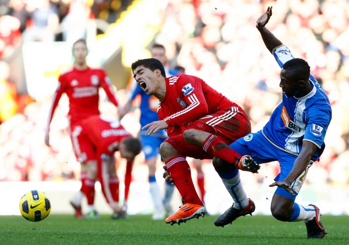Robin van Persie skoraði bæði mörk Arsenal í 2-0 sigri á Úlfunum á Emirates í ensku úrvalsdeildinni í dag og minnkaði Arsenal því forskot Manchester United á toppnum aftur niður í fjögur stig. Wigan náði jafntefli á móti Liverpool á Anfield og West Ham náði stigi þrátt fyrir að hafa lent 3-0 undir. Arsenal minnkaði forskot Manchester United aftur í fjögur stig eftir 2-0 sigur á Wolves en Úlfarnir höfðu unnið United um síðustu helgi. Robin van Persie skoraði bæði mörk Arsenal í leiknum og hefur því skorað níu mörk í síðustu fimm deildarleikjum. Van Persie kom Arsenal í 1-0 með góði viðstöðulausu skoti á 16. mínútu leiksins eftir að hafa fengið flotta sendingu frá Cesc Fabregas. Van Persie kom Arsenal í 2-0 á 56. mínútu eftir hraða sókn. Fabregas stakk boltanum inn á Theo Walcott sem lagði hann í fyrsta fyrir á Van Persie sem skoraði af mikilli yfirvegun. Arsenakl var miklu betra liðið í leiknum og hefði auðveldlega getað skorað mun fleiri mörk. Luis Suarez í leiknum í dag.Mynd/AP Luis Suarez var í byrjnarliði Liverpool í fyrsta sinn og skaut bæði í stöngina og slánna í leiknum en tókst ekki að skora þegar Liverpool gerði 1-1 jafntefli á heimavelli á móti Wigan. Liverpool var búið að vinna fjóra leiki í röð fyrir leikinn. Raul Meireles kom Liverpool í 1-0 á 24. mínútu þegar hann hamraði boltann viðstöðulaust rétt innan vítateigs eftir að fyrirgjöf Fabio Aurelio hafði viðkomu í varnarmanni. Þetta var fimmta mark hans í síðustu sex leikjum. Steve Gohouri jafnaði metin á 65. mínútu eftir að Antolin Alcaraz skallaði fyrirgjöf Charles N'Zogbia til hans en það var mikil rangstöðulykt af markinu. Nikola Zigic tryggði Birmingham 1-0 sigur á Stoke með marki í uppbótartíma en það var hinsvegar ekkert mark skoraði í jafntefli Blackburn og Newcastle á Ewood Park. Roy Hodgson var í stúkunni og sá nýju lærisveina sína glutra niður 3-0 forystu.Mynd/AP Blackppol og Aston Villa gerðu 1-1 jafntefli þar sem bæði mörkin komu í upphafi leiks. Gabriel Agbonlahor kom Aston Villa í 1-0 á 10. mínútu eftir stungusendingu frá Darren Bent en Elliot Grandin jafnaði aðeins fjórum mínútum síðar þegar hann skallaði inn hornspyrnu frá Charlie Adam. Aston Villa lék manni færra síðustu 20 mínúturnar eftir að Jean Makoun fékk beint rautt spjald. West Bromwich og West Ham gerðu 3-3 jafntefli í fjörugum fallbaráttuslag. West Bromwich Albion byrjaði frábærlega í fyrsta leiknum undir stjórn Roy Hodgson því liðið komst í 3-0 eftir aðeins rúmlega hálftíma leik. West Ham náði að jafna metin í seinni hálfleik þar sem Demba Ba skoraði tvö mörk í sínum fyrsta leik í byrjunarliði West Ham.Úrslit og markaskorarar í ensku úrvalsdeildinni í dag:Jonas Olsson og Carlton Cole í skallaeinvígi í leiknum.Mynd/APManchester United-Manchester City 2-1 1-0 Nani (41.), 1-1 David Silva (65.), 2-1 Wayne Rooney (78.) Arsenal-Wolves 2-0 1-0 Robin van Persie (16.), 2-0 Robin van Persie (56.)Birmingham-Stoke 1-0 1-0 Nikola Zigic (90.+3)Blackburn-Newcastle 0-0Blackpool-Aston Villa 1-1 0-1 Gabriel Agbonlahor (10.), 1-1 Elliot Grandin (14.)Liverpool-Wigan 1-1 1-0 Raúl Meireles (24.), 1-1 Steve Gohouri (65.)West Bromwich-West Ham 3-3 1-0 Graeme Dorrans (3.), 2-0 Jerome Thomas (8.), 3-0 Sjálfsmark (31.), 3-1 Demba Ba (51.), 3-2 Carlton Cole (57.), 3-3 Demba Ba (83.)
