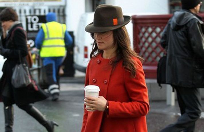 Pippa Middleton, 28 ára, systir Kate Middleton hertogaynjunnar af Cambridge, vakti athygli þegar hún arkaði til vinnu í miðborg Lundúna síðasta fimmtudag. Eins og sjá má á myndunum var Pippa poppuð í útliti með hatt á höfði, klædd í appelsínugula kápu og brún stígvél. Pippa, sem starfar sem partíplanari, hefur eflaust tekið að sér að skipuleggja afmælisveislu systur sinnar sem er þrítug í dag.
