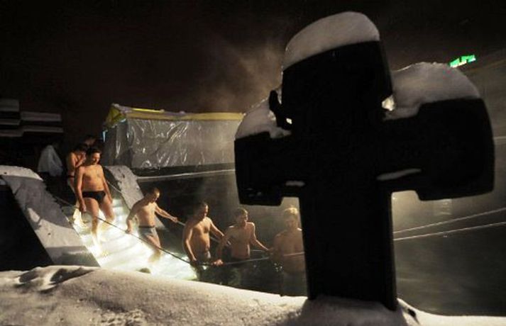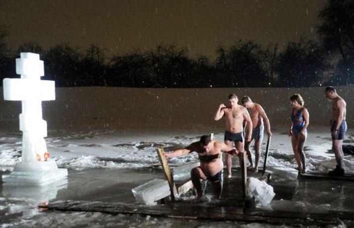 Hin árlega epiphany-hátíð var haldin í Rússlandi í gær. Meðlimir rússnesku rétttrúnaðarkirkjunnar steyptu sér þá í jökulkalt vatn og minntust þannig skírn Jesús Krists. Epiphany-hátíðin er haldin í bænum Tyarlevo í Rússlandi. Klerkar skera þá risavaxinn kross í ísilagt stöðuvatn og kveikja á kertum allt í kring. Tilbiðjendur dýfa sér síðan þrisvar og er það gert með vísun í hina heila þrenningu. Þannig eru syndir þeirra afmáðar. Klerkar blessa vatnið og er stöðuvatnið álitið heilagt svæði þangað til að hátíðin verður haldin á næsta ári. Þeir sem steypa sér til sunds fá einnig að geyma nokkra dropa en margir trúa því að vatnið búi yfir dulmögnuðum mætti.