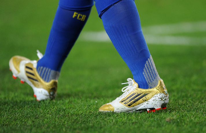 Lionel Messi hefur verið á skotskónum það sem af er þessu tímabili með Barcelona en argentínski snillingurinn er ekkert hræddur við að skipta um takkaskó. Messi ætlar nefnilega að frumsýna nýja skó í El Clasico á kvöld þar sem Barcelona mætir Real í fyrri leik liðanna í átta liða úrslitum spænska bikarsins. Lionel Messi er þessa dagana að kynna nýja adidas-skó sem heita F50 adizero en skórnir í kvöld verða í blárri og rauðri útgáfu. Messi lék í gullnum skóm í sínum fyrsta leik eftir að hann fékk Gullbolta FIFA og skoraði þá tvö mörk í 4-2 sigri á Real Betis á sunnudagskvöldið. Messi hefur nú skorað 33 mörk í 30 leikjum með Barcelona í öllum keppnum á þessu tímabili en þar af hafa 19 þeirra komið í 18 leikjum í spænsku deildinni. F50 adizero skórnir hafa fengið mikið lof enda hannaðir eftir nýjustu tækni í dag og vega sem dæmi aðeins 165 grömm. Skórnir eru líka sérhannaðir fyrir hvern og einn leikmann og fer lokahönnun þeirra eftir því hvernig hlaup leikmaðurinn tekur og hve mikið leikmaðurinn hleypur í leik. Messi verður reyndar ekki sá eini á Santiago Bernabeu í kvöld sem klæðist F50 adizero skónum því Real Madrid mennirnir Karim Benzema og Fabio Coentrao eru báðir í slíkum skóm sem hafa verið sérhannaðir fyrir þá. Til að fullkomna skóna hjá Messi þá er áletrunin "FIFA Ballon d'Or Player of the Tear" saumuð í hliðina á skónum hans til að það fari ekkert á milli mála hver sé þar á ferð. Hér fyrir ofan má sjá myndir af skónum frá því í leiknum á móti Real Betis um helgina.