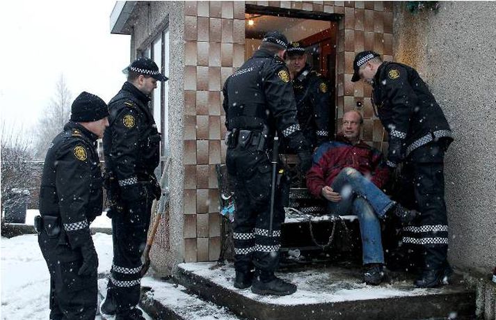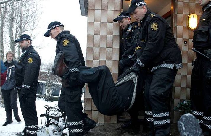 Húsmóðirin í Breiðagerði: Ég get ekki talað núna Jón Hákon Halldórsson skrifar 17. janúar 2012 15:43 Lögreglumenn bera mann út úr húsinu að Breiðagerði. mynd/ pjetur Það varð fátt um svör þegar Vísir reyndi að ná tali af Önnu Lilju Valgeirsdóttur, íbúa í Breiðagerði 7, þar sem lögreglan aðstoðaði fulltrúa sýslumanns við að bera fólk út í morgun. „Ég get eiginlega ekki talað núna. Allt í lagi bless," sagði hún í samtali við blaðamenn. Eins og fréttastofa Stöðvar 2 og Vísis greindi frá í dag kom um 20 manna hópur frá Heimavarnarliðinu saman í dag í húsinu að Breiðagerði þegar til stóð að bera eigandann út. Fólkið kom sér fyrir inni í stofu þegar fulltrúar sýslumannsins og lögreglan mættu. Til nokkurra átaka kom og voru tveir handteknir að sögn heimildarmanna fréttastofu. Sama mál komst í hámæli í ágúst síðastliðnum þegar hópur fólks kom eigandanum til hjálpar og varnaði fulltrúum sýslumanns inngöngu í húsið. Þá náðist sátt í málinu og var því frestað. Nú hefur eigandinn hinsvegar endanlega verið borinn út. Hér má sjá myndir sem Pjetur Sigurðsson ljósmyndari tók af vettvangi. Mest lesið Fátækari eftir að hafa svindlað á ferðakonum Innlent Hvar er opið á aðfangadag? Innlent Tveir lögreglumenn sprengdir í loft upp Erlent Blússandi hagvöxtur í Bandaríkjunum Erlent Minni rekstrarkostnaður fyrir eigendur bensínháka Innlent Bæta við allt að 200 íbúðum og mathöll í Spöngina Innlent Foreldrar skipverjans fá áheyrn í Hæstarétti Innlent Maður í umferðarslysi reyndist fíkniefnasali Innlent Arion banki varar við svikaherferð Innlent Innflytjendamálin almenningi efst í huga Innlent Fleiri fréttir Gleðileg jól kæru lesendur Einn fluttur á sjúkrahús eftir bílslys Skiluðu hagnaði á kosningaári Hátíðarveisla á kaffistofu Samhjálpar: „Það er ró og friður yfir fólki“ Björgunarsveitin kölluð út í fokverkefni Grjóthrun undir Eyjafjöllum Fátækari eftir að hafa svindlað á ferðakonum Arion banki varar við svikaherferð Innanlandsflugi aflýst Foreldrar skipverjans fá áheyrn í Hæstarétti Hvar er opið á aðfangadag? Innflytjendamálin almenningi efst í huga Bæta við allt að 200 íbúðum og mathöll í Spöngina Maður í umferðarslysi reyndist fíkniefnasali Minni rekstrarkostnaður fyrir eigendur bensínháka Hafnar „jólakveðju“ ríkisins Hefði þurft hjólbörur undir öll verðlaunin sín Ýmis ráð til taugatrekktra á Þorláksmessu Ekkert því til fyrirstöðu að Ásthildur Lóa verði aftur ráðherra Óvissa um ráðherraskipan og skata fyrir byrjendur Maðurinn fundinn Sigríður Halldórsdóttir nýr ritstjóri Kastljóss Íslendingur í gæsluvarðhaldi í Kólumbíu vegna gruns um kynferðisbrot Forsætisráðuneytið eyddi meiru í almannatengla í fyrra en í ár Inkalla snuð vegna of mikils magns BPA-plastefna Svanhildur Sif heiðruð Falskar netverslanir: Auglýsir rýmingarsölu nokkrum dögum eftir opnun Meðallaun upplýsingafulltrúa hækkuðu hlutfallslega mest Skötuilmurinn leggst yfir landið og Samkeppniseftirlitið ætlar að fylgjast vel með bensínverðinu Áfram auknar líkur á eldgosi Sjá meira