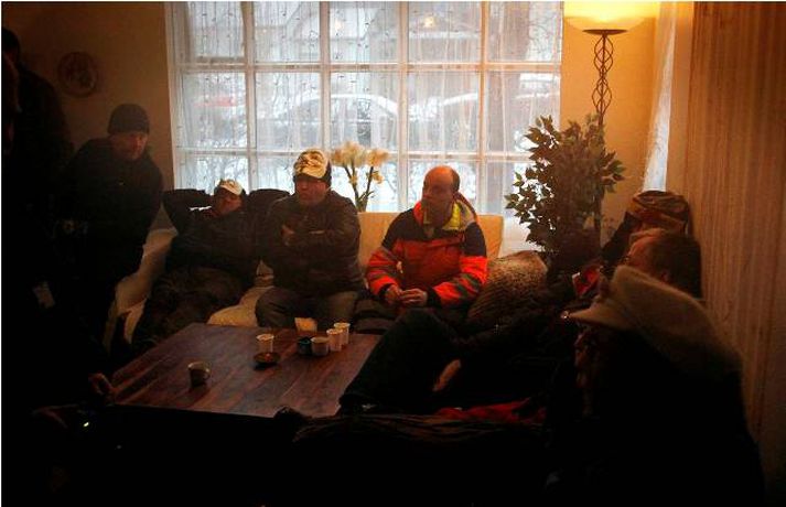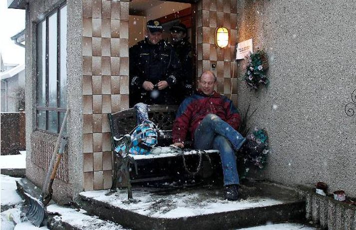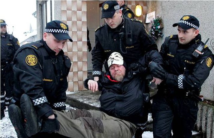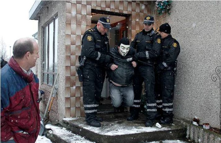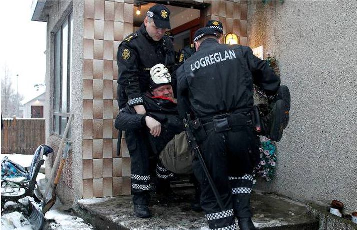 Það varð fátt um svör þegar Vísir reyndi að ná tali af Önnu Lilju Valgeirsdóttur, íbúa í Breiðagerði 7, þar sem lögreglan aðstoðaði fulltrúa sýslumanns við að bera fólk út í morgun. „Ég get eiginlega ekki talað núna. Allt í lagi bless," sagði hún í samtali við blaðamenn. Eins og fréttastofa Stöðvar 2 og Vísis greindi frá í dag kom um 20 manna hópur frá Heimavarnarliðinu saman í dag í húsinu að Breiðagerði þegar til stóð að bera eigandann út. Fólkið kom sér fyrir inni í stofu þegar fulltrúar sýslumannsins og lögreglan mættu. Til nokkurra átaka kom og voru tveir handteknir að sögn heimildarmanna fréttastofu. Sama mál komst í hámæli í ágúst síðastliðnum þegar hópur fólks kom eigandanum til hjálpar og varnaði fulltrúum sýslumanns inngöngu í húsið. Þá náðist sátt í málinu og var því frestað. Nú hefur eigandinn hinsvegar endanlega verið borinn út. Hér má sjá myndir sem Pjetur Sigurðsson ljósmyndari tók af vettvangi.