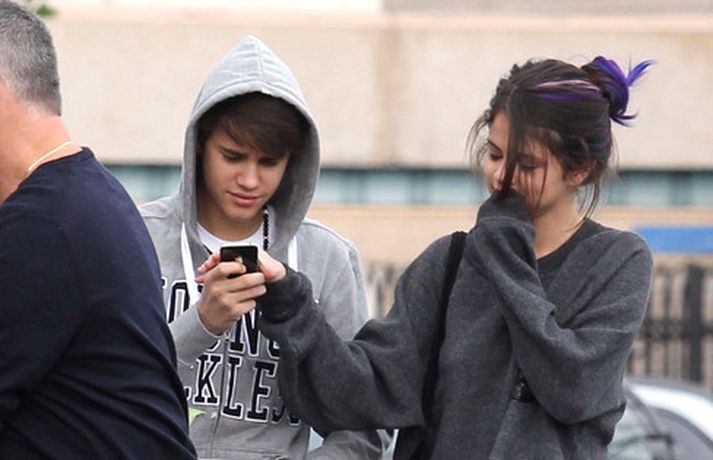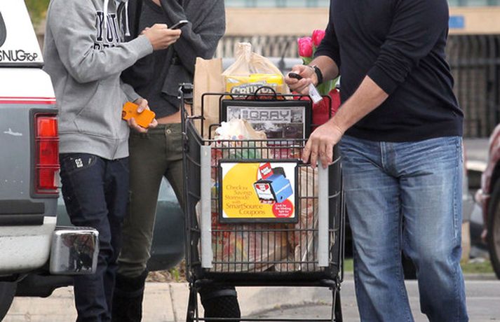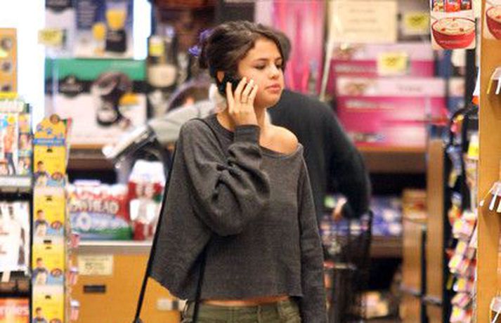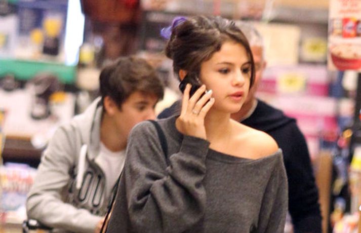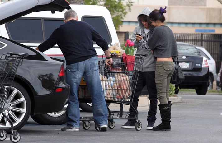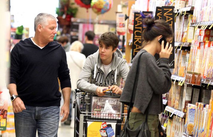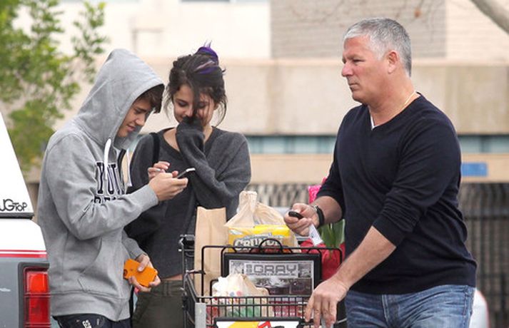 Söngvarinn Justin Bieber, 17 ára, og unnusta hans, söng- og leikkonan Selena Gomez, 19 ára, versluðu saman í matvöruverslun í Kaliforníu á milli þess sem þau töluðu í símann eða sendu sms. Eins og sjá má á meðfylgjandi myndum var roskinn maður með parinu sem sá um innkaupakerruna fyrir stjörnurnar.