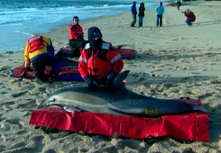 Fjöldi höfrunga synti á land við Cape Cod 17. janúar 2012 07:17 Um 40 höfrungar syntu á land á við Cape Cod í Massachusetts í Bandaríkjunum um síðustu helgina. Meðlimum dýraverndunarsamtaka hefur tekist að að bjarga 19 þeirra og koma þeim aftur á haf út en um 20 hafa drepist. Katie Moore, sem stjórnar björgunaraðgerðum á staðnum, segir í samtali við CNN að þetta sé aðeins í annað sinn á síðustu 15 árum sem svo margir höfrungar synda á landi í einu við Cape Cod en algengt er að sjá eitt eða tvö dýr í fjörunni á þessum slóðum á tímabilinu frá janúar og fram í apríl. Ekki er vitað með vissu afhverju höfrungarnir synda á land á þessum slóðum. Mest lesið Gengst nú við skilaboðunum umdeildu Innlent Stigmögnun í nágrannaerjum: „Hann vildi keyra á mig“ Innlent Hægt að nálgast vottorð um að makinn hafi rangt fyrir sér Innlent „Það átti að taka mig í karphúsið“ Innlent Selenskí undir miklum þrýstingi Innlent „Einhver SA prins mættur til að láta sem allt sé bara kózý“ Innlent Trump fer í fýlu og dregur boð sitt til Carney til baka Erlent Játaði meira og meira eftir því sem á leið Innlent Eldur í sendibíl á Miklubraut Innlent Segist ekki muna eftir að hafa sent skilaboðin Innlent Fleiri fréttir Grinch siglt til hafnar í Marseille Ólympíufarinn eftirlýsti gómaður eftir áratug á flótta Bein útsending: Þorgerður ávarpar mannréttindaráðið vegna Íran Viðurkenna loks, fyrir mistök, að Úkraínumenn hafi sökkt Moskvu Repúblikanar leita aftur á náðir Musks Leysir upp þingið og boðar til kosninga í Japan Sex særðir eftir hnífaárás á mótmælum í Antwerpen Rússar, Úkraínumenn og Bandaríkjamenn funda í fyrsta sinn við sama borð Trump fer í fýlu og dregur boð sitt til Carney til baka „Við getum gert það sem við viljum“ Viti ekki hvað er í samningi NATO sem semji ekki fyrir hönd Grænlands Frakkar riðu á vaðið og tóku skuggaskip Rússa Sendi Evrópu tóninn: „Þú mótar ekki nýja heimsmynd með eintómum orðum“ Draumur Trumps um „Rivíeru Mið-Austurlanda“ lifir enn Samkomulagið sem ekkert samkomulag er um Drógu mann út á nærbuxunum sem hafði ekkert til saka unnið Trump kynnti friðarráðið Sýknaður af ásökunum um aðgerðaleysi þegar nítján börn dóu Rutte samdi ekki við Trump fyrir hönd danska konungsríkisins Handtóku fimm ára dreng og föður hans og sendu til Texas Samkomulagið veiti Bandaríkjunum aðgang að auðlindum Grænlands „Ramma framtíðarsamkomulags“ náð um Grænland og hætt við tolla Var á ráðstefnunni í Davos: „Fólk andaði kannski aðeins léttar“ X fyllist af gríni um Ísland/Grænland Þessi hönd er um sjötíu þúsund ára gömul Verði að eignast þetta „stóra fallega stykki af ís“ Fyrstu viðbrögð við ræðu Donalds Trump: „Ég bíð enn eftir að mennirnir í hvítu sloppunum nái í hann“ Höfuðstöðvar UNRWA í Jerúsalem rifnar Reyndu að fá dómara til að hlutast til um mál Le Pen Eldræða Carney: „Ef þú ert ekki við borðið þá ertu á matseðlinum“ Sjá meira