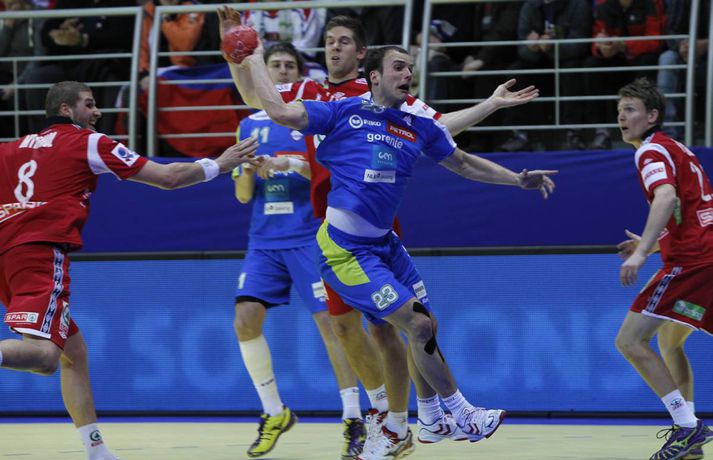 Norðmenn mörðu sigur gegn Slóveníu Henry Birgir Gunnarsson í Vrsac skrifar 16. janúar 2012 18:38 Úr leik liðanna í dag. mynd/vilhelm Noregur vann nauman sigur, 28-27, á Slóvenum í opnunarleik D-riðils í Vrsac í kvöld. Leikurinn var afar kaflaskiptur en Norðmenn voru sterkari á lokamínútunum og tryggðu sér tvö dýrmæt stig. Norðmenn byrjuðu leikinn með miklum látum og eftir tíu mínútna leik voru þeir með yfirburðastöðu, 6-0. Fyrsta mark Slóvena í leiknum kom ekki fyrr en eftir tæpar 11 mínútur og þá skoruðu þeir þrjú mörk á einni mínútu. Markvörður Slóvena, Gorazd Skof, komst í mikið stuð og fór að verja eins og brjálæðingur. Slóvenar keyrðu góð hraðaupphlaup og minnkuðu muninn smám saman. Það tókst þeim rétt fyrir hlé og staðan í hálfleik var 14-14. Slóvenar hófu síðari hálfleikinn með álíka látum og þeir luku þeim fyrri. Norðmenn voru sem steinrunnir er baráttuglaðir Slóvenar keyrðu yfir þá. Fljótlega í síðari hálfleik var staðan orðin 16-20 fyrir Slóvena. Norðmenn neituðu að gefast upp og unnu sig aftur inn í leikinn. Þegar korter lifði leiks náðu þeir að jafna, 21-21. Lokamínútur leiksins voru æsispennandi þar sem liðin héldust í hendur. Ole Erevik datt svo í stuð í norska markinu, varði meðal annars tvö víti og Noregur leiddi með tveimur mörkum, 26-24, þegar tvær mínútur voru eftir. Slóvenar minnkuðu muninn í eitt mark en svo var markvörður þeirra rekinn af velli fyrir mótmæli. Christoffer Rambo kom Noregi í 27-25, Slóvenía svaraði að bragði en Norðmenn fengu víti er 13 sekúndur voru eftir af leiknum. Það tók Havard Tvedten og skoraði örugglega. Slóvenar skoruðu síðasta markið en það dugði ekki til. Bjarte Myrhol, Christoffer Rambo og Erlend Mamelund skoruðu allir sex mörk fyrir Noreg og Ole Erevik varði 20 skot í rammanum. Uros Zorman og Dragan Gajic voru markahæstir Slóvena með fimm mörk. Markvörðurinn skapheiti, Gorazd Skof, varði 19 skot. Mest lesið Bjarka sagt að koma ekki aftur til Ungverjalands Handbolti „Beint flug til Köben og nokkrir veikindadagar“ Handbolti Skýrsla Henrys: Nú er hún gamla Grýla dauð Handbolti Einkunnir Strákanna okkar á móti Ungverjalandi: Viktor vaggaði Ungverjagrýlunni í svefn Handbolti EM í dag: Flensuleikur Jordans og athyglissjúkir dómarar Handbolti „Núna er allt betra“ Handbolti Uppgjörið: Ísland - Ungverjaland 24-23 | Ísland fer með tvö stig í millirðil Sport „Besta íslenska landslið sem við höfum mætt“ Handbolti Færeyingar úr leik og Danir stigalausir í milliriðil Handbolti „Ég hef prófað þetta og þetta virkar“ Handbolti Fleiri fréttir EM í dag: Flensuleikur Jordans og athyglissjúkir dómarar Bjarka sagt að koma ekki aftur til Ungverjalands Vitum ekki um tvo fyrstu mótherjana fyrr en annað kvöld Skýrsla Henrys: Nú er hún gamla Grýla dauð „Núna er allt betra“ Logi Geirs hefði verið sáttur með svona „hárgreiðsluskot“ „Beint flug til Köben og nokkrir veikindadagar“ „Ég hef prófað þetta og þetta virkar“ „Bara vá, ég er svo glaður“ Einkunnir Strákanna okkar á móti Ungverjalandi: Viktor vaggaði Ungverjagrýlunni í svefn Tölfræðin á móti Ungverjum: Viktor lokaði í átta mínútur þegar ekkert gekk Færeyingar úr leik og Danir stigalausir í milliriðil Svartfellingar hjálpuðu alls ekki Færeyingum Kemst loksins á leik og styður Ísland til sigurs Mikil trú á íslenskum sigri meðal stuðningsmanna Íslands Viktor Gísli líka frábær í Fantasy Utan vallar: Ég get ekki meir „Besta íslenska landslið sem við höfum mætt“ „Sáru töpin sitja í okkur“ „Örugglega orðinn hundleiður á umræðunni“ „Það er mjög slæm minning“ Knorr lofaði Alfreð: Enginn egóisti og róaði okkur Alfreð mætti með sína menn klára í leik upp á líf eða dauða „Það trompast allt þarna“ Dagur henti tveimur leikmönnum sínum upp í stúku Austurríkismenn hjálpuðu Alfreð Dagur fagnaði sigri á móti Faxa EM í dag: Það eru engar afsakanir í boði „Lífshættulegt“ gólf losnaði í einni af EM-höllunum Einar í ræktina en fær ekki að æfa með hópnum Sjá meira