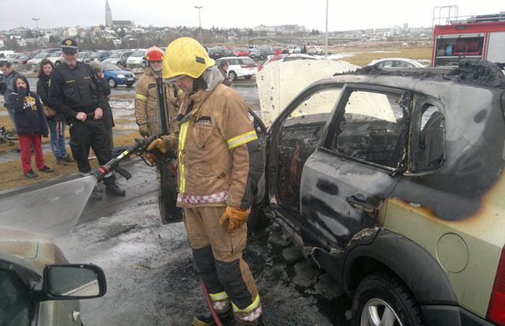 Bíll varð alelda við Háskólann Jón Hákon Halldórsson skrifar 16. janúar 2012 13:28 Bíllinn er gerónýtur eins og sést. mynd/ Pétur Örn Pétursson. Bíll varð alelda við Háskóla Íslands nú um eittleytið í dag. Töluverðan reyk lagði frá bílnum og sást hann alveg frá Miklubraut. Slökkviliðsmenn eru búnir að slökkva eldinn, en bíllinn er gerónýtur. Samkvæmt upplýsingum fréttastofu skemmdust nærliggjandi bílar líka. Ekki er vitað hvað olli því að það kviknaði í bílnum en eldsins mun fyrst hafa orðið vart undir vélarhlífinni. Sé smellt á myndasafnið hér fyrir neðan sjást myndir sem Pétur Örn Pétursson og Friðrik Þór Halldórsson myndatökumaður tóku. Þær sýna hversu illa bíllinn brann.mynd/ Pétur Örn Pétursson.mynd/ Pétur Örn Pétursson.mynd/ Friðrik Þór Halldórssonmynd/ Friðrik Þór Halldórsson Mest lesið Fátækari eftir að hafa svindlað á ferðakonum Innlent Hvar er opið á aðfangadag? Innlent Tveir lögreglumenn sprengdir í loft upp Erlent Blússandi hagvöxtur í Bandaríkjunum Erlent Minni rekstrarkostnaður fyrir eigendur bensínháka Innlent Bæta við allt að 200 íbúðum og mathöll í Spöngina Innlent Foreldrar skipverjans fá áheyrn í Hæstarétti Innlent Maður í umferðarslysi reyndist fíkniefnasali Innlent Arion banki varar við svikaherferð Innlent Innflytjendamálin almenningi efst í huga Innlent Fleiri fréttir Gleðileg jól kæru lesendur Einn fluttur á sjúkrahús eftir bílslys Skiluðu hagnaði á kosningaári Hátíðarveisla á kaffistofu Samhjálpar: „Það er ró og friður yfir fólki“ Björgunarsveitin kölluð út í fokverkefni Grjóthrun undir Eyjafjöllum Fátækari eftir að hafa svindlað á ferðakonum Arion banki varar við svikaherferð Innanlandsflugi aflýst Foreldrar skipverjans fá áheyrn í Hæstarétti Hvar er opið á aðfangadag? Innflytjendamálin almenningi efst í huga Bæta við allt að 200 íbúðum og mathöll í Spöngina Maður í umferðarslysi reyndist fíkniefnasali Minni rekstrarkostnaður fyrir eigendur bensínháka Hafnar „jólakveðju“ ríkisins Hefði þurft hjólbörur undir öll verðlaunin sín Ýmis ráð til taugatrekktra á Þorláksmessu Ekkert því til fyrirstöðu að Ásthildur Lóa verði aftur ráðherra Óvissa um ráðherraskipan og skata fyrir byrjendur Maðurinn fundinn Sigríður Halldórsdóttir nýr ritstjóri Kastljóss Íslendingur í gæsluvarðhaldi í Kólumbíu vegna gruns um kynferðisbrot Forsætisráðuneytið eyddi meiru í almannatengla í fyrra en í ár Inkalla snuð vegna of mikils magns BPA-plastefna Svanhildur Sif heiðruð Falskar netverslanir: Auglýsir rýmingarsölu nokkrum dögum eftir opnun Meðallaun upplýsingafulltrúa hækkuðu hlutfallslega mest Skötuilmurinn leggst yfir landið og Samkeppniseftirlitið ætlar að fylgjast vel með bensínverðinu Áfram auknar líkur á eldgosi Sjá meira