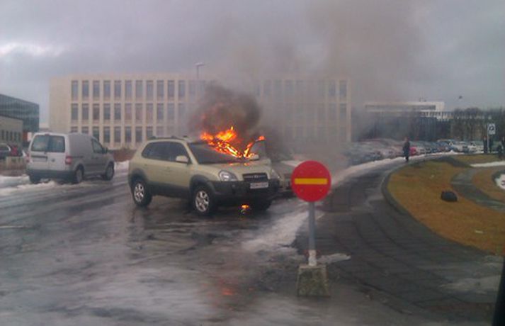 Bíll varð alelda við Háskóla Íslands nú um eittleytið í dag. Töluverðan reyk lagði frá bílnum og sást hann alveg frá Miklubraut. Slökkviliðsmenn eru búnir að slökkva eldinn, en bíllinn er gerónýtur. Samkvæmt upplýsingum fréttastofu skemmdust nærliggjandi bílar líka. Ekki er vitað hvað olli því að það kviknaði í bílnum en eldsins mun fyrst hafa orðið vart undir vélarhlífinni. Sé smellt á myndasafnið hér fyrir neðan sjást myndir sem Pétur Örn Pétursson og Friðrik Þór Halldórsson myndatökumaður tóku. Þær sýna hversu illa bíllinn brann.mynd/ Pétur Örn Pétursson.mynd/ Pétur Örn Pétursson.mynd/ Friðrik Þór Halldórssonmynd/ Friðrik Þór Halldórsson
