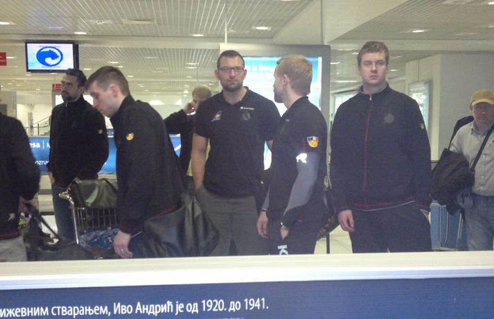 Íslenska handboltalandsliðið er lent í Serbíu eftir flug frá London en íslenska liðið lagði af stað frá Keflavík í morgun. Strákarnir okkar munu spila sinn fyrsta leik á EM á móti Króatíu á mánudaginn. Ferðalagið var ekkert sérstakt en allir eru hressir samkvæmt fréttamanni Vísis, Henry Birgi Gunnarssyni, sem er líka á leiðinni á mótið. Ferðlagið er þó ekki alveg búið því framundan er tveggja tíma rútuferð frá Belgrad til Vrsac þar sem riðill íslenska liðsins fer fram. Vilhelm Gunnarsson, ljósmyndari Vísis og Fréttablaðsins, smellti af nokkrum myndum af strákunum og má sjá þær hér með fréttinni.