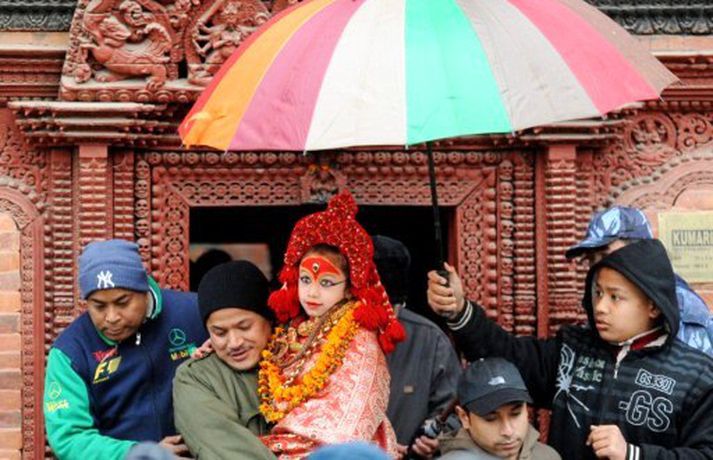 Fimm ára gömul gyðja kom opinberlega fram á trúarhátíð í Nepal á mánudaginn. Hún er heilagt trúartákn í augum hindúa í Nepal og mun gegna hlutverki lifandi gyðju þangað til að hún hefur tíðir í fyrsta sinn. Gyðjan er kölluð Kumari og hefur fjöldi stúlkna gengt hlutverki hennar í gegnum tíðina. Kumari er sögð vera holdtekja gyðjunnar Kali. Nepalbúar trúa því að Kumari verndi þá gegn illu og boði gæfu og hagsæld. Kumari er sýnd opinbera 13 sinnum ári en mestum tíma eyðir hún í musteri sínu. Kumari kom síðast fram á trúarhátíð í Katmandú á mánudaginn. Bókstafleg þýðing Kumari er jómfrú en hún er dýrkuð þangað til að hún verður kynþroska. Núverandi Kumari bjó upphaflega í búddatrúarsamfélagi. Hún þurfti að gangast undir 32 prófraunir áður en hún var útnefnd sem Kumari. Að auki má verðandi Kumari aldrei hafa misst blóð.