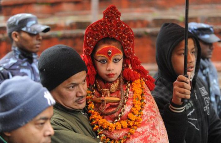 Lifandi gyðja kom fram á trúarhátíð í Nepal 11. janúar 2012 21:53 Gyðjan Kumari í skrúðklæðum. mynd/AP Fimm ára gömul gyðja kom opinberlega fram á trúarhátíð í Nepal á mánudaginn. Hún er heilagt trúartákn í augum hindúa í Nepal og mun gegna hlutverki lifandi gyðju þangað til að hún hefur tíðir í fyrsta sinn. Gyðjan er kölluð Kumari og hefur fjöldi stúlkna gengt hlutverki hennar í gegnum tíðina. Kumari er sögð vera holdtekja gyðjunnar Kali. Nepalbúar trúa því að Kumari verndi þá gegn illu og boði gæfu og hagsæld. Kumari er sýnd opinbera 13 sinnum ári en mestum tíma eyðir hún í musteri sínu. Kumari kom síðast fram á trúarhátíð í Katmandú á mánudaginn. Bókstafleg þýðing Kumari er jómfrú en hún er dýrkuð þangað til að hún verður kynþroska. Núverandi Kumari bjó upphaflega í búddatrúarsamfélagi. Hún þurfti að gangast undir 32 prófraunir áður en hún var útnefnd sem Kumari. Að auki má verðandi Kumari aldrei hafa misst blóð. Mest lesið Vinum hans ekki litist á blikuna Innlent Segjast hafa sviðsett aftöku og hirt verðlaunaféð af Rússum Erlent Kveður klettinn í lífi sínu eftir skyndileg veikindi Innlent Tekur stóra skammta af magnýl og leiðist að hreyfa sig Erlent Pétur verið lengur en hún í stjórnmálum Innlent Veki furðu að bílaleigubílar séu ekki á nagladekkjum Innlent Barist á götum úti í Íran fimmta daginn í röð Erlent Fluttur á sjúkrahús eftir slys í Hrútafirði Innlent Fimm daga þjóðarsorg lýst yfir í Sviss Erlent Þessi fjórtán hlutu fálkaorðuna á nýársdegi Innlent Fleiri fréttir Tekur stóra skammta af magnýl og leiðist að hreyfa sig Barist á götum úti í Íran fimmta daginn í röð Segjast hafa sviðsett aftöku og hirt verðlaunaféð af Rússum Fimm daga þjóðarsorg lýst yfir í Sviss Óttast að um fjörutíu hafi látist á skemmtistaðnum Sór embættiseiðinn á niðurlagðri neðanjarðarlestarstöð Kirkja í Amsterdam alelda Tugir látnir eftir sprengingu í svissneskum skíðabæ Kamilla Bretadrottning greinir frá kynferðisofbeldi Dótturdóttir JFK er látin Handtóku 357 meinta ISIS-liða í kjölfar mannskæðra átaka „Sannur Finni“ fær hæli í Rússlandi Sífellt fleiri hermenn falla á ári hverju Hvetur ESB til að svara refsiaðgerðunum Bandaríkjanna fullum hálsi Þrítugasta árásin á bát meintra smyglara TikTok-áskorun leiddi til banafalls af útvarpsmastri Blóðbaðið í El Fasher: Milljón manna borg orðin að „draugabæ“ Neita að ræða við Úkraínumenn vegna meintrar árásar á heimili Pútíns Sádar sprengja hergögn frá furstadæmunum í Jemen og hóta frekari árásum Á lista yfir þrjú hlýjustu ár í mælingasögunni Selenskí sver af sér drónaárás á heimili Pútíns Bandaríkin leggja til tvo milljarða dala með skilyrðum Trump hótar skelfilegum afleiðingum afvopnist Hamas ekki Neita að tjá sig um ummæli Trumps um árás í Venesúela Kim ánægður með nýjar stýriflaugar Þrír lögregluþjónar og sex ISIS-liðar fallnir eftir átök í Tyrklandi Vill lengri tryggingar og tilbúinn til að hitta Pútín Frímúrarareglan vill lögbann á nýjar lögreglureglur Milljón dalir eða meira fyrir náðun Umkringdu Taívan og æfðu lokanir hafna Sjá meira