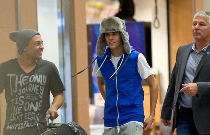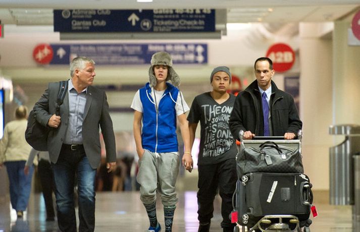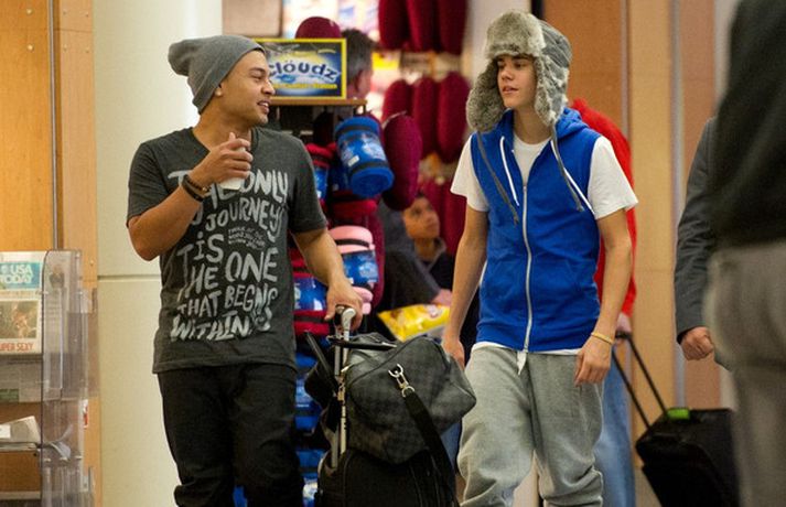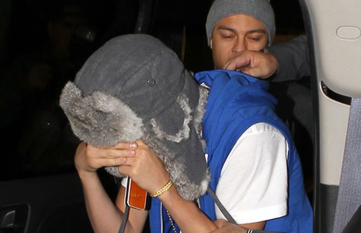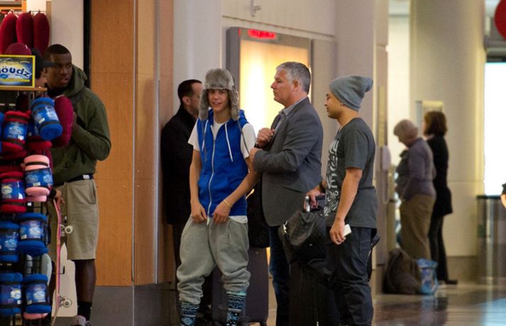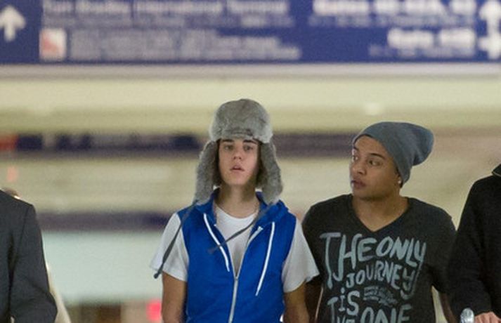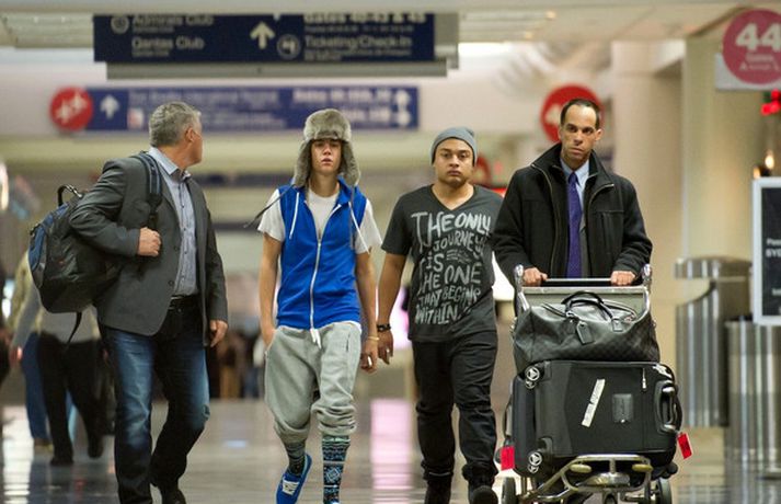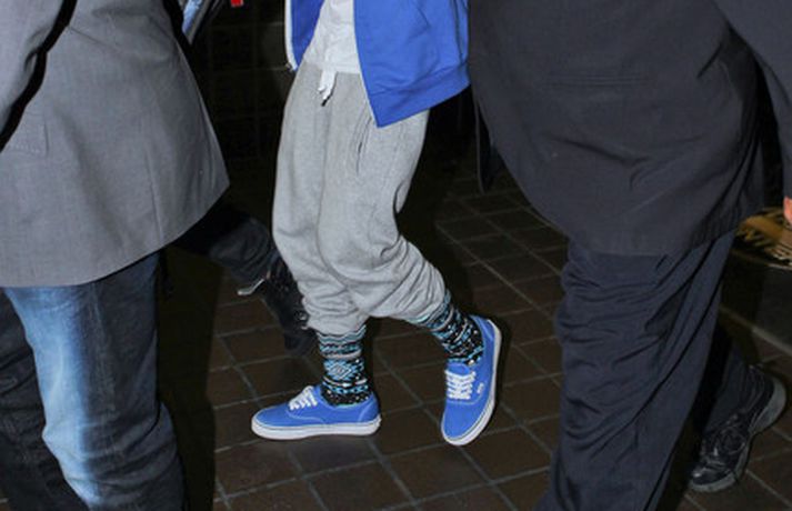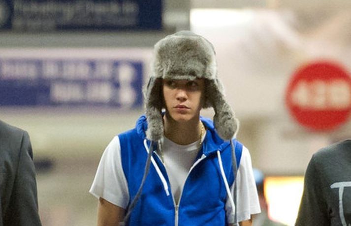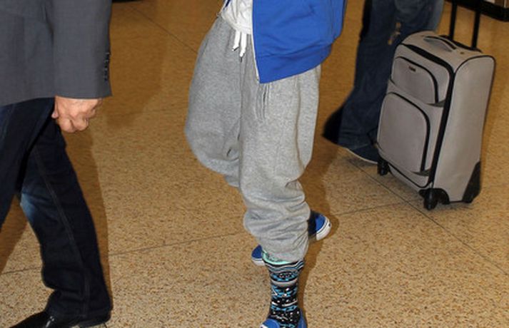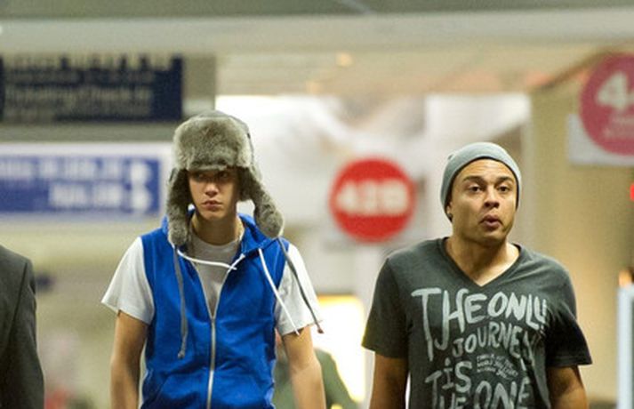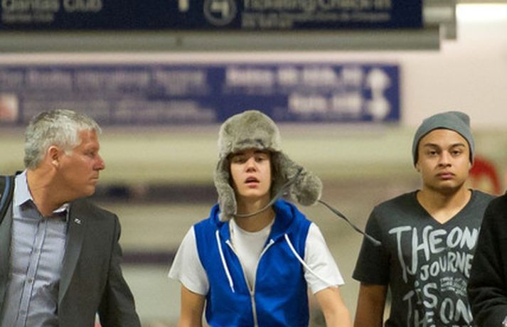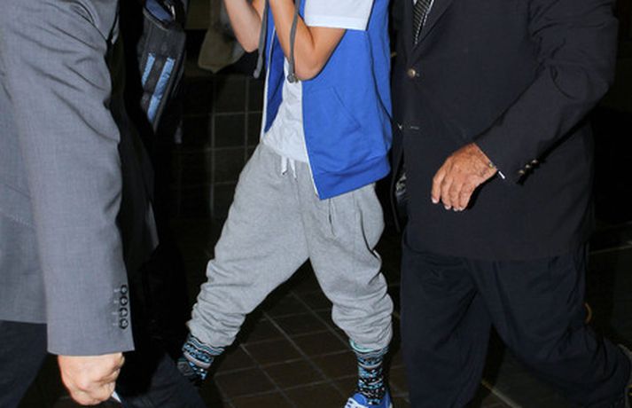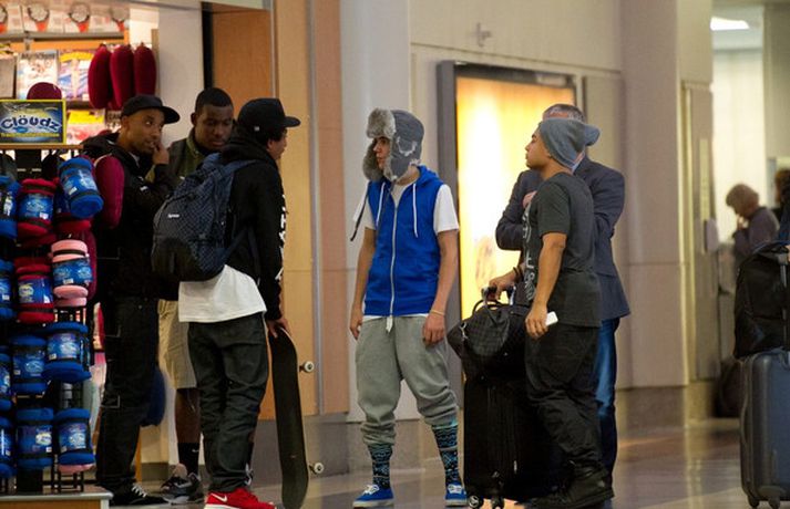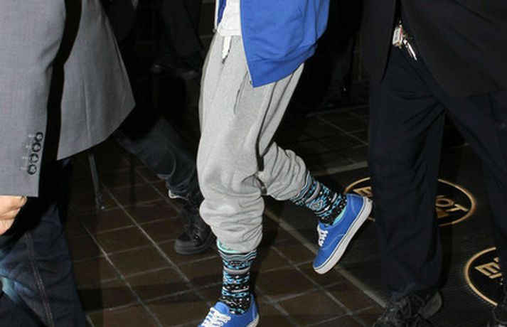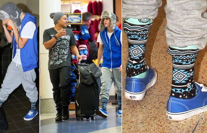 Kanadíski söngvarinn Justin Bieber, 17 ára, var klæddur í munstraða háa sokka í gær þegar hann gekk í gegnum LAX flugvöllinn. Justin reyndi að flýja nærstadda ljósmyndara og hylja andlit sitt eins og sjá má á myndunum.Ég eyði tíma með vinum mínum, fer til dæmis oft í bíó. En ég er oft hjá Jaden (13 ára sonur leikarans Will Smith) þegar ég er í Los Angeles, sagði söngvarinn spurður hvernig hann eyðir frítíma sínum.