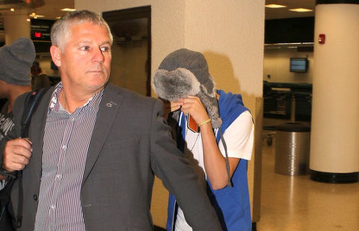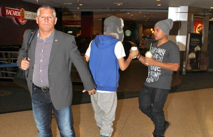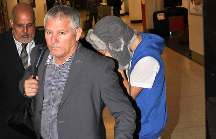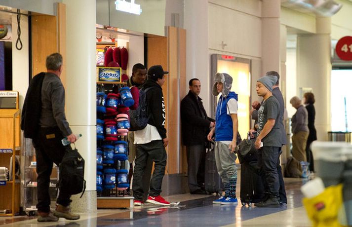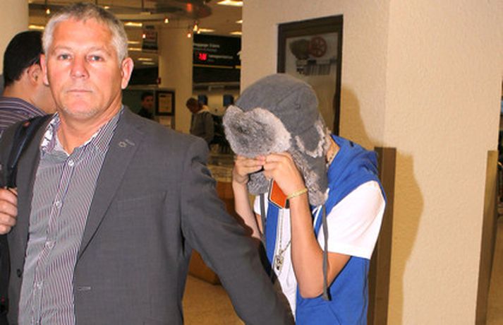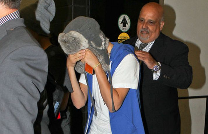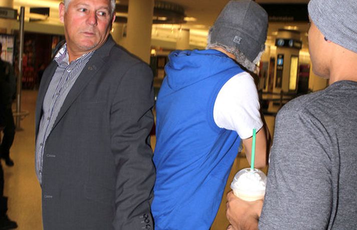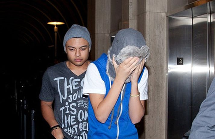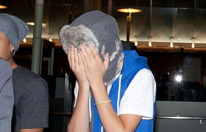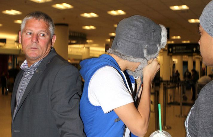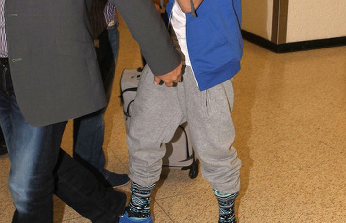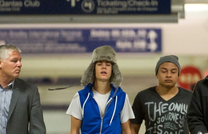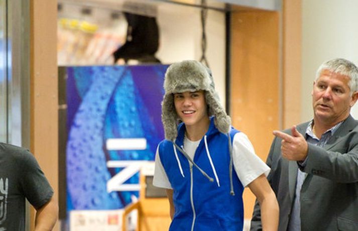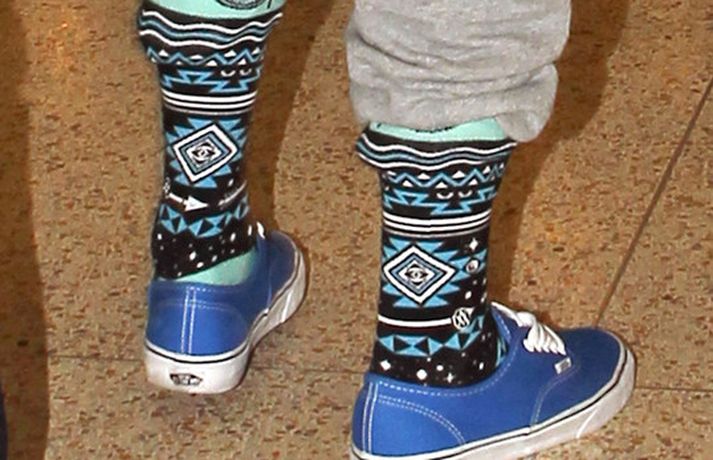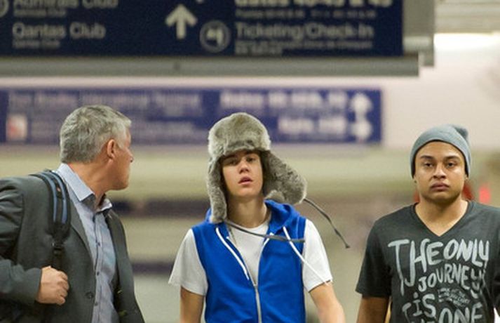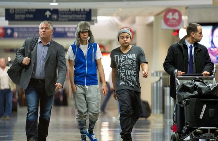 Kanadíski söngvarinn Justin Bieber, 17 ára, var klæddur í munstraða háa sokka í gær þegar hann gekk í gegnum LAX flugvöllinn. Justin reyndi að flýja nærstadda ljósmyndara og hylja andlit sitt eins og sjá má á myndunum.Ég eyði tíma með vinum mínum, fer til dæmis oft í bíó. En ég er oft hjá Jaden (13 ára sonur leikarans Will Smith) þegar ég er í Los Angeles, sagði söngvarinn spurður hvernig hann eyðir frítíma sínum.