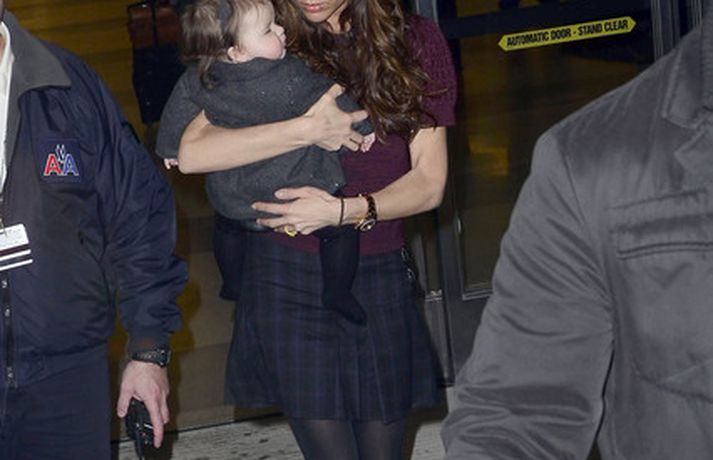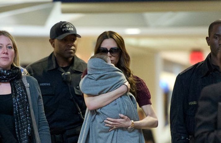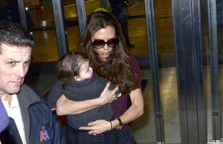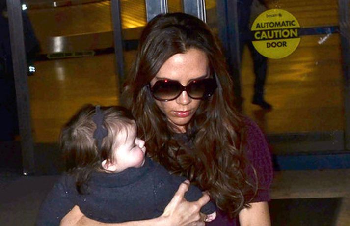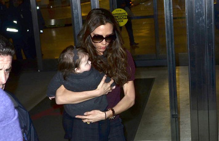 Victoria Beckham og dóttir hennar, Harper Seven, voru myndaðar á LAX flugvellinum í Los Angeles. Með mæðgunum í för var barnfóstra en engir lífverðir. Öryggisverðir fylgdu þeim úr flugstöðvarbyggingunni sökum ágengra ljósmyndara.