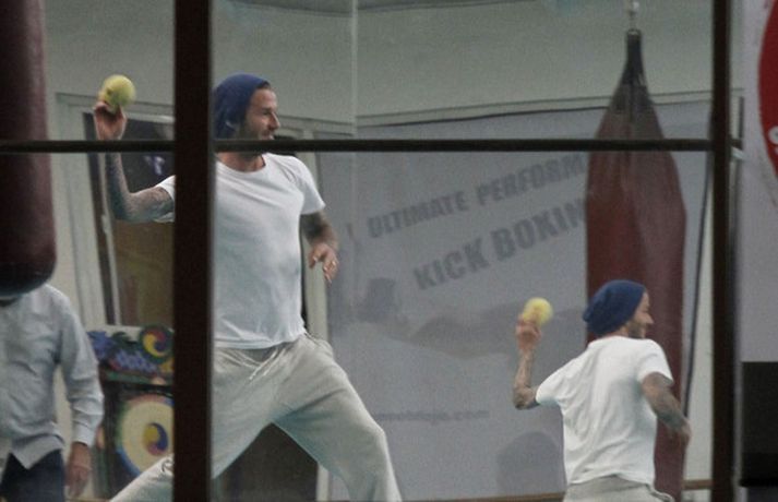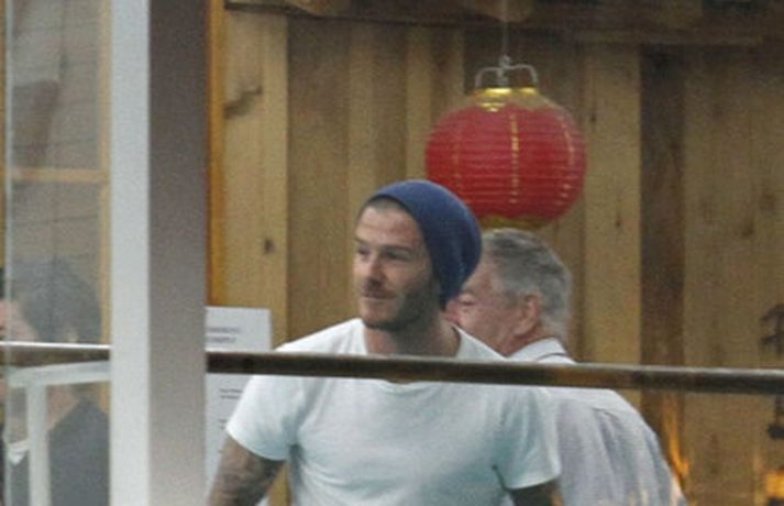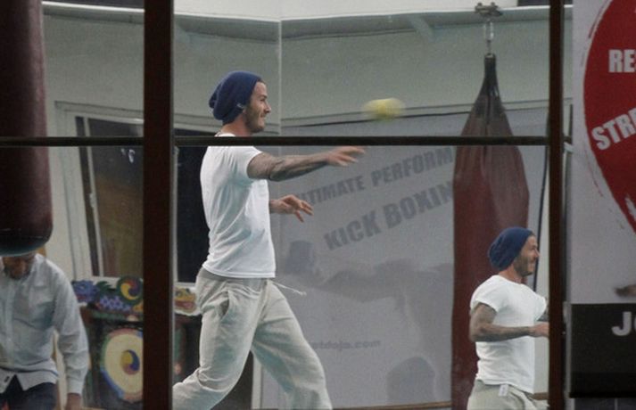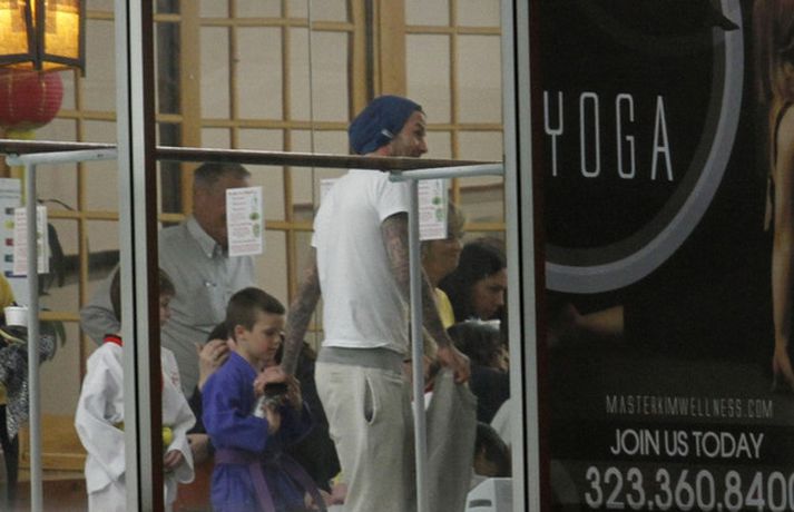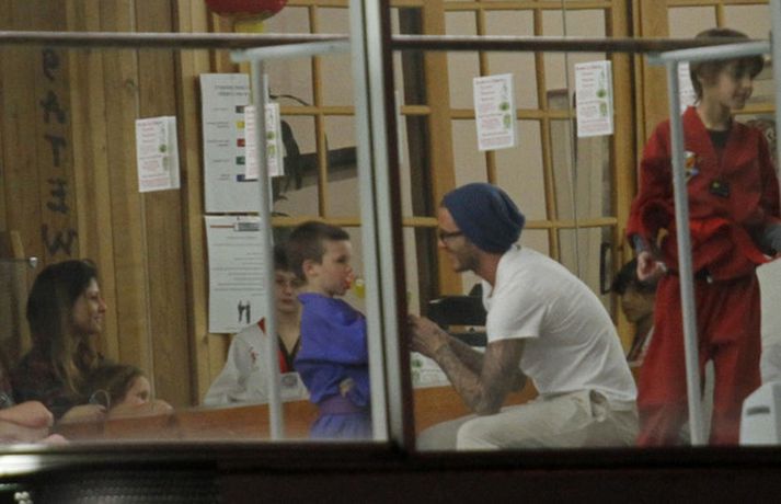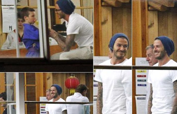 David Beckham, 36 ára, naut sín í karatetíma með syni sínum Romeo í gær eins og sjá má á meðfylgjandi myndum. Kappinn sem léki á alls oddi var skælbrosandi með húfu og gleraugu.Ég leyfi mér ekki að kvarta því ég nýt forréttinda að gera það sem ég geri best, sagði David.