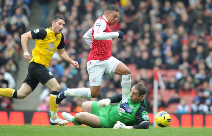 Robin van Persie skoraði þrennu og Alex Oxlade-Chamberlain var með tvö mörk þegar Arsenal-liðið hrökk í gang og vann 7-1 stórsigur á Blackburn Rovers. Þetta var fyrsti sigur Arsenal á árinu 2004 en liðið var aðeins búið að ná í eitt stig úr síðustu fjórum leikjum sínum. Thierry Henry kom inn á sem varamaður í seinni hálfleik og skoraði sjöunda og síðasta markið. Theo Walcott átti mjög góðan dag eins og þeir Van Persie og Oxlade-Chamberlain en Walcott lagði upp þrjú mörk í leiknum. Arsenal-liðið sundurspilaði Blackburn-liðið í þessum leik og sigurinn hefði vel getað orðið enn stærri. Robin van Persie lagði upp tvö mörk auk þess að skora þrjú mörk sjálfur. Robin van Persie var búinn að koma Arsenal í 1-0 eftir aðeins 80 sekúndur eftir frábæran undirbúning frá Theo Walcott. Morten Gamst Pedersen jafnaði hálftíma síðar með glæsilegu marki beint út aukaspyrnu en Arsenal-liðið svaraði með tveimur mörkum með tveggja mínútna millibili. Robin van Persie skoraði það fyrra á 38. mínútu eftir aðra frábæra stoðsendingu frá Walcott og Van Persie lagði síðan upp þriðja markið fyrir Alex Oxlade-Chamberlain á 40. mínútu. Gaël Givet fékk síðan rauða spjaldið fyrir tveggja fóta tæklingu á Robin van Persie á 43. mínútu. Möguleikar Blackburn voru þá endanlega úr sögunni. Mikel Arteta skoraði fjórða markið á 51. mínútu í kjölfarið á hornspyrnu Van Persie en Laurent Koscielny lagði til hans boltans. Arteta mætti Blackburn þrisvar í deildinni í vetur (einu sinni með Everton) og skoraði í öllum leikjunum. Alex Oxlade-Chamberlain var ekki hættur því hann skoraði fimmta markið á 54. mínútu eftir frábæran undirbúning Theo Walcott. Robin van Persie innsiglaði þrennu sína á 61. mínútu eftir flotta sendingu Francis Coquelin og góða skiptingu hjá Oxlade-Chamberlain. Arsenal átti eftir að bæta einu marki við því Thierry Henry kom inn á sem varamaður og skoraði sjöundan markið í uppbótartíma eftir sendingu frá Robin van Persie.Staðan í ensku úrvalsdeildinni.