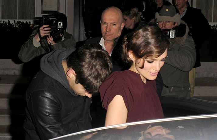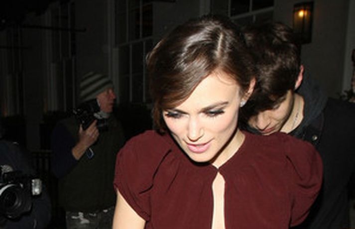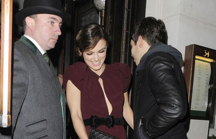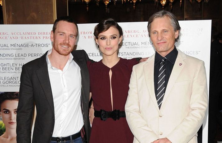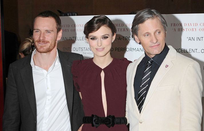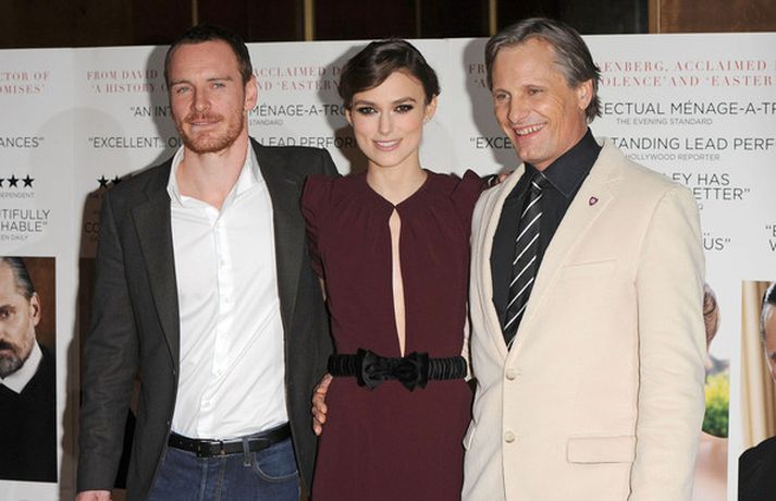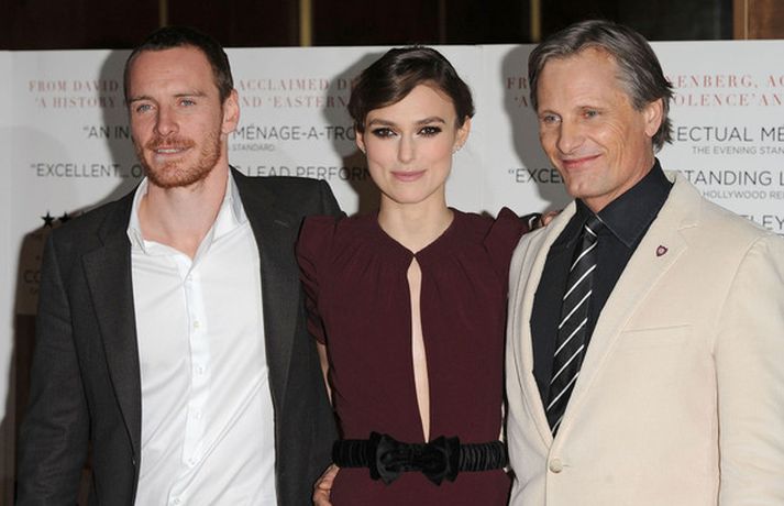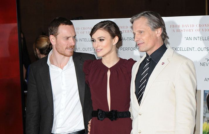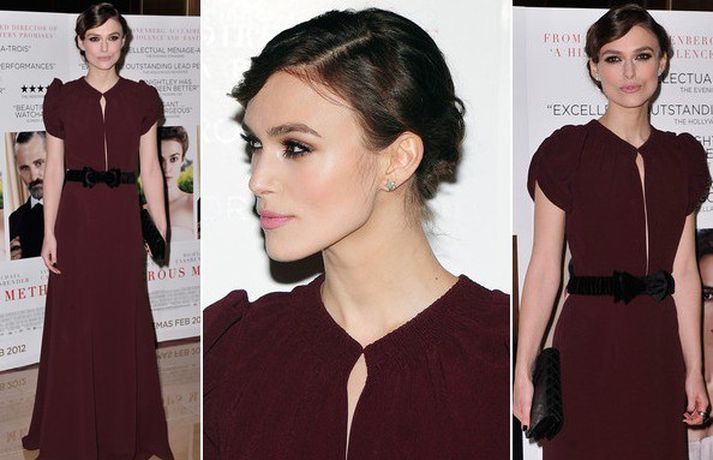 Leikkonan Keira Knightley, 26 ára, var stórglæsileg í vinrauðum Burberry kjól með uppsett hárið á frumsýningu kvikmyndinnarinnar A Dangerous Method. Viggo Mortensen, meðleikari hennar, var heldur ekkert svo slæmur eins og sjá má á myndunum.