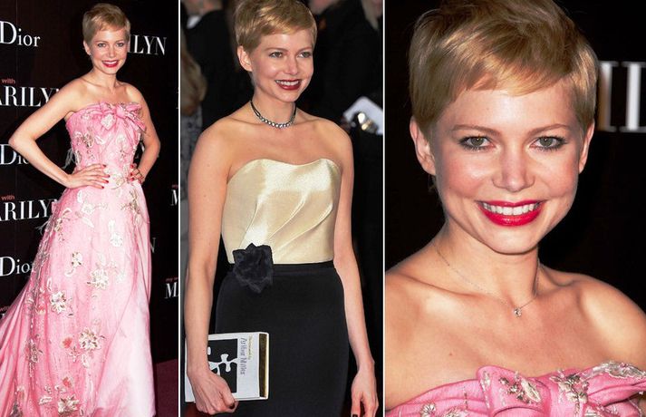 Leikkonan Michelle Williams, 31 árs, var stórglæsileg í bleikum Dior síðkjól á frumsýningu myndarinnar My Week With Marilyn kvikmyndahúsinu Gaumont Marignan í París í Frakklandi í gærkvöldi. Þá má sjá leikkonuna í tvískiptum kjól frá H&M á BAFTA (British Academy Film Awards) verðlaunahátíðinni í London í Englandi. Eins og sjá má á myndunum kann Michelle svo sannarlega að velja réttu kjólana fyrir rauða dregilinn.